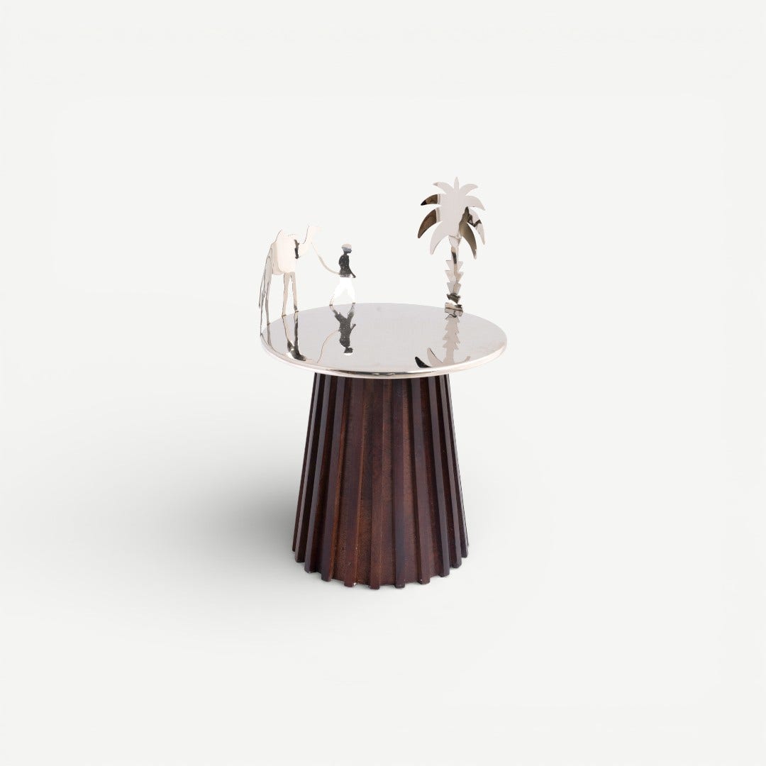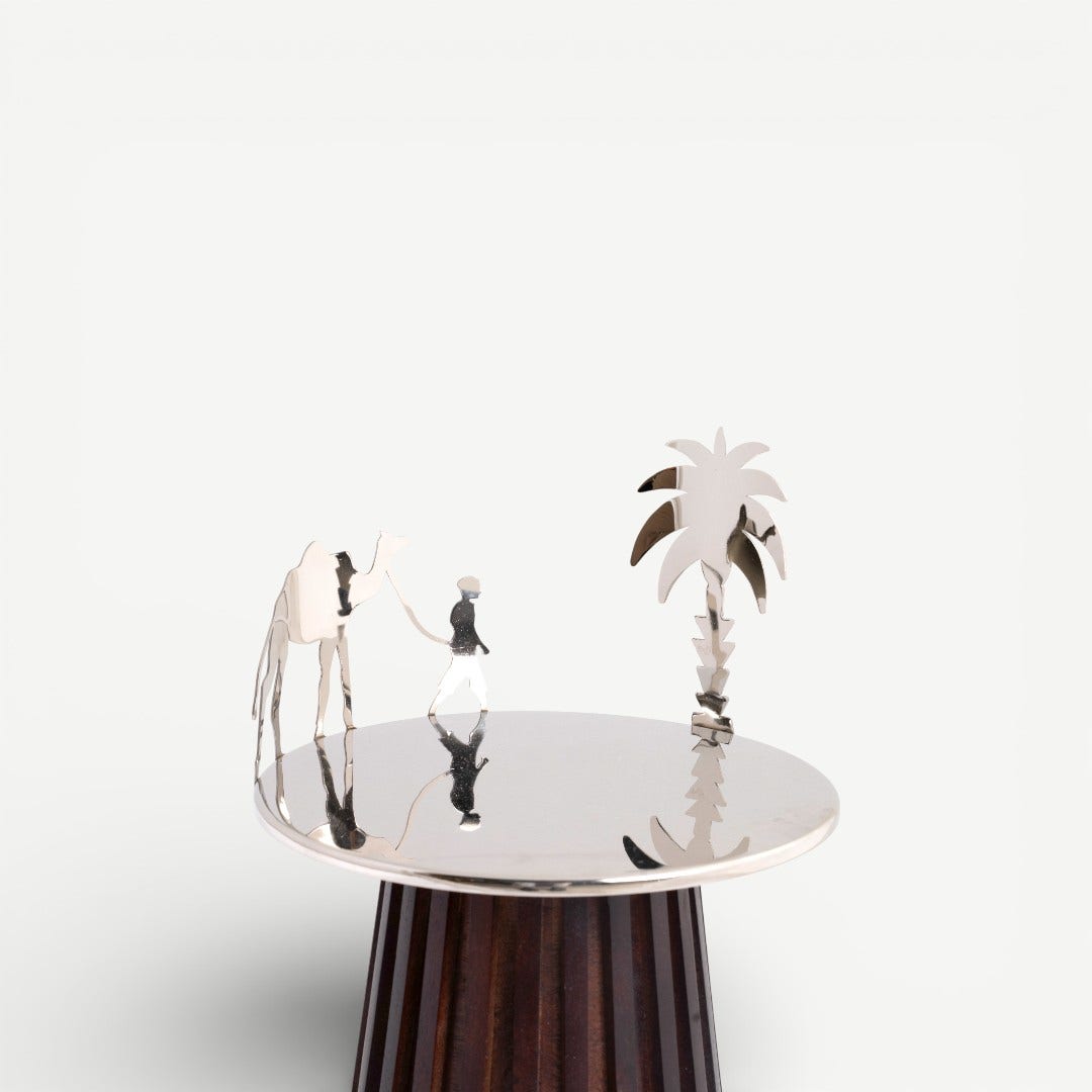 A poetic tribute to desert heritage and timeless hospitality. This dessert stand is more than a serving piece; it is a narrative centerpiece that brings a sense of journey and storytelling to your table. The fluted, dark-toned wooden base provides a rhythmic foundation, topped with a sleek, polished silver surface that reflects the light of your home. Perched upon this shimmering horizon is a delicate structure of a traveler and their camel, moving toward the shade of a solitary palm, a scene that evokes the quiet majesty of a sunset in the dunes.
