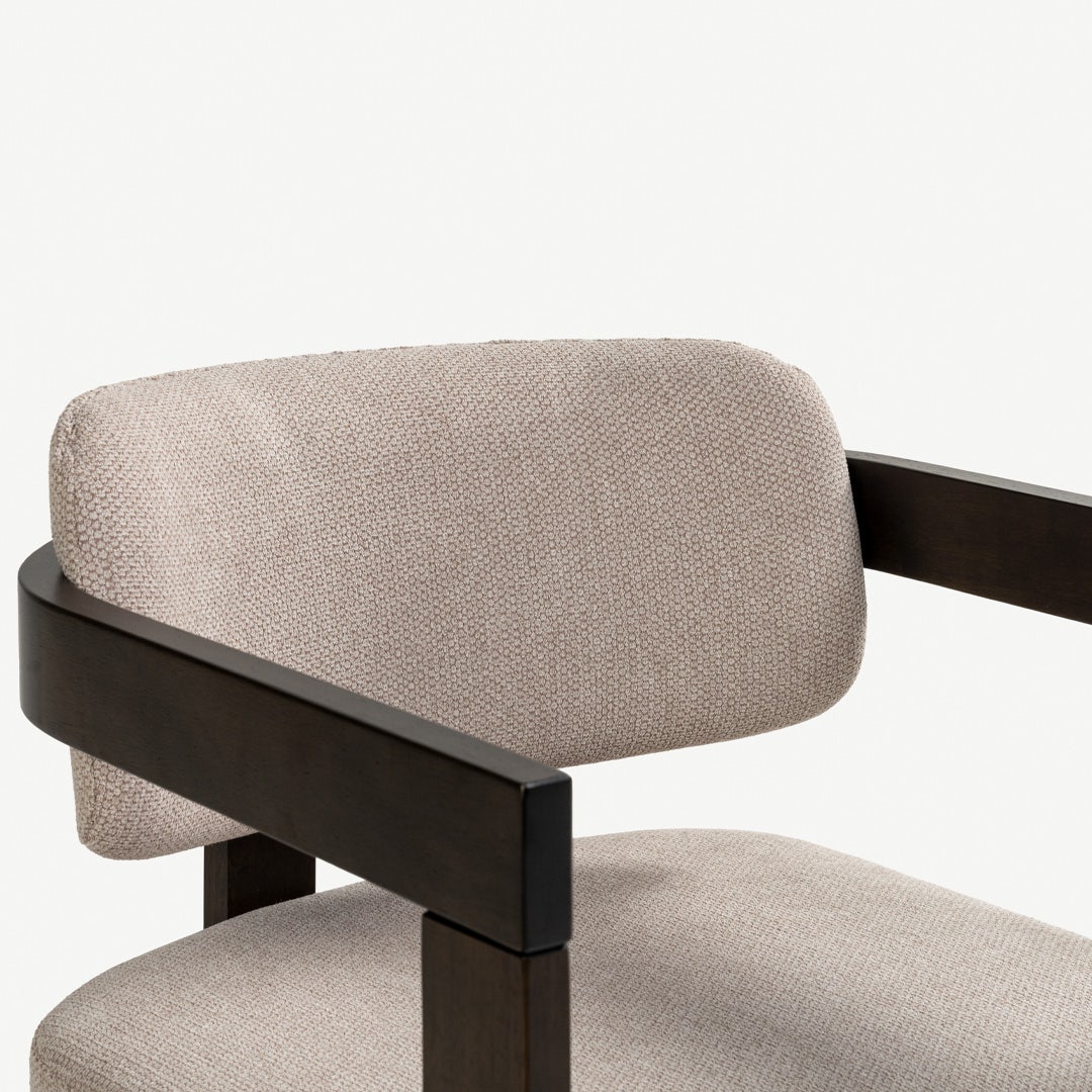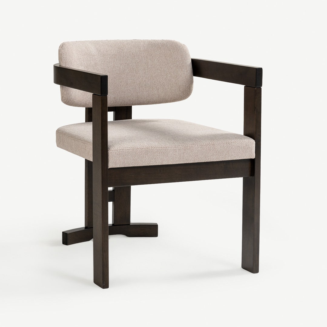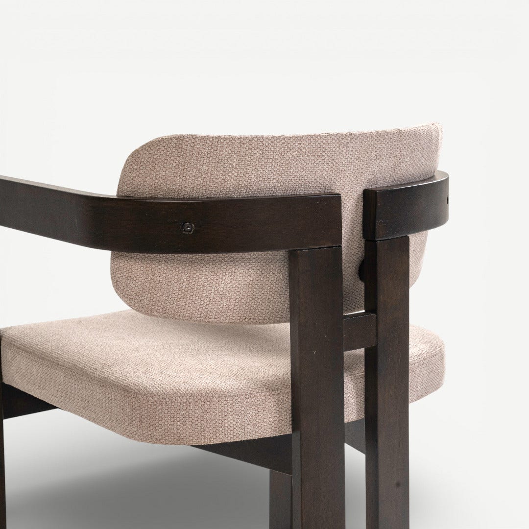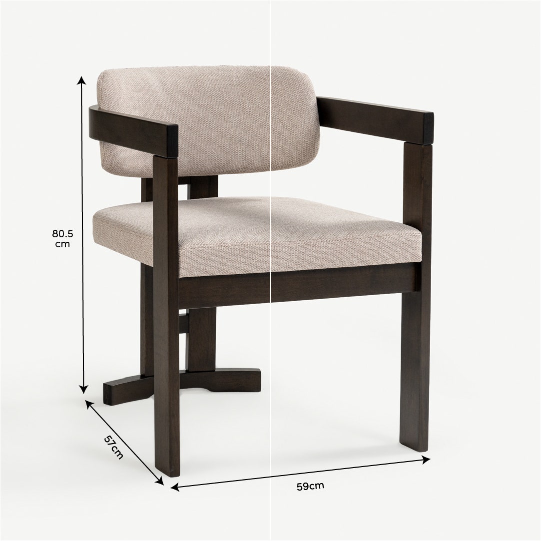 With its sculptural wooden frame and soft, tailored cushions, the Ingram Dining Chair brings a curated, gallery-inspired feel to your dining space. The dark rubberwood frame contrasts beautifully with the beige upholstery, creating a warm yet modern palette. Foam-filled cushions offer comfort, while the chair’s geometric construction gives your space a refined, intentional look.