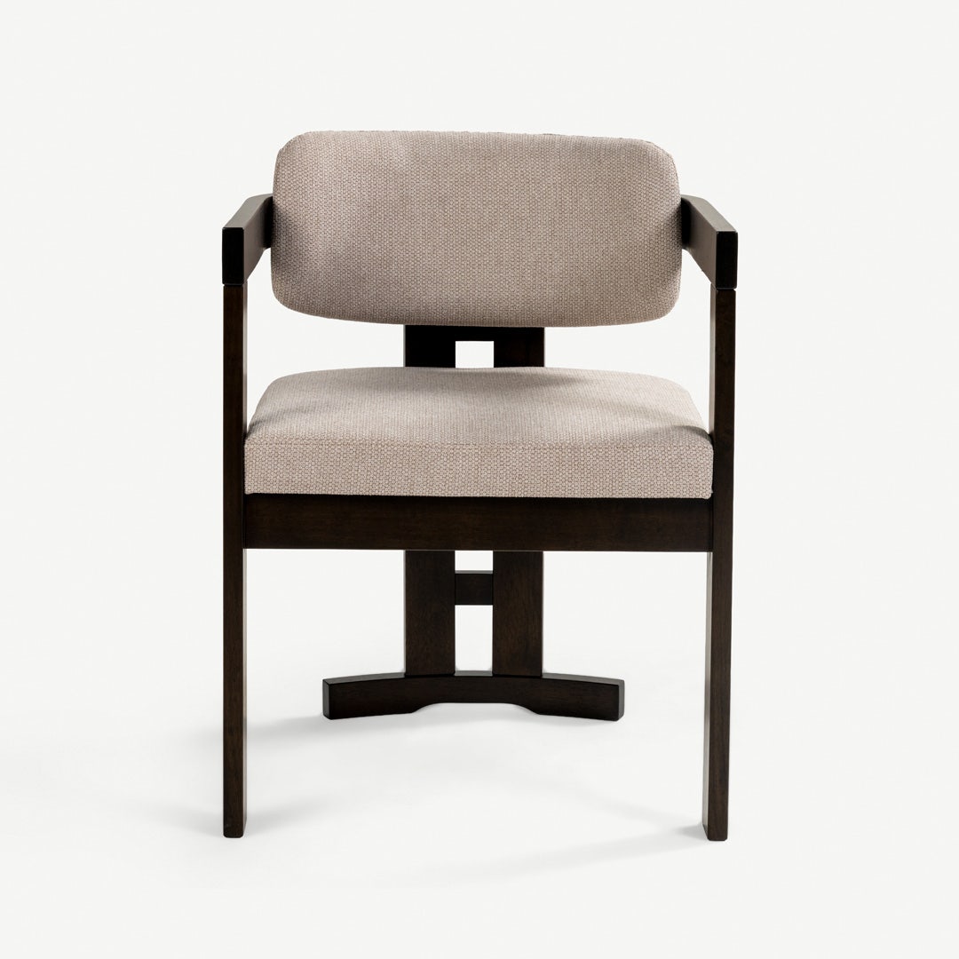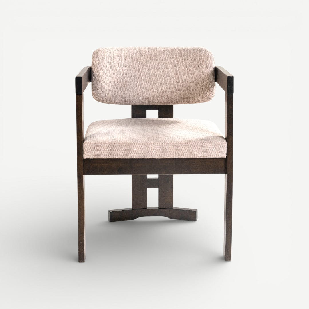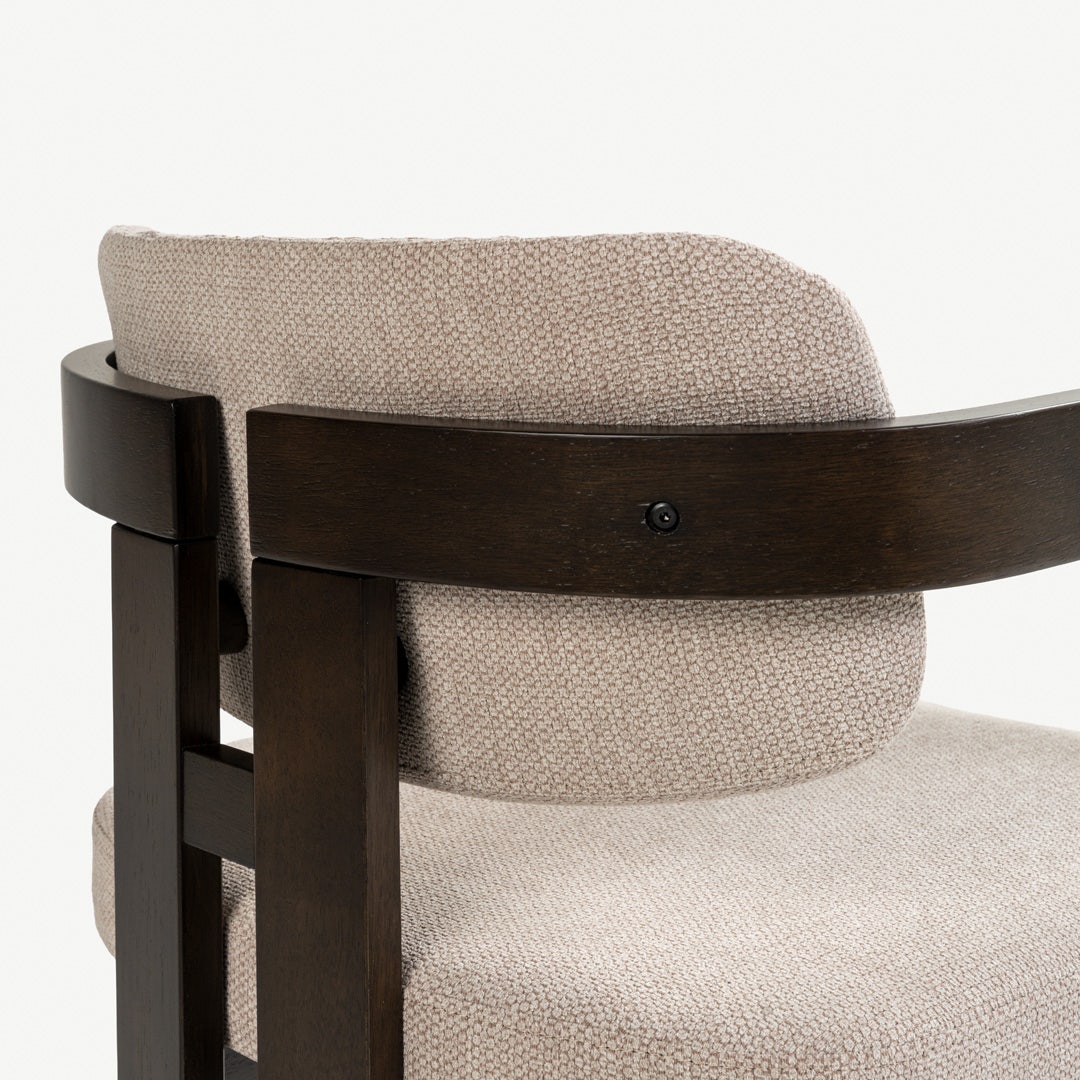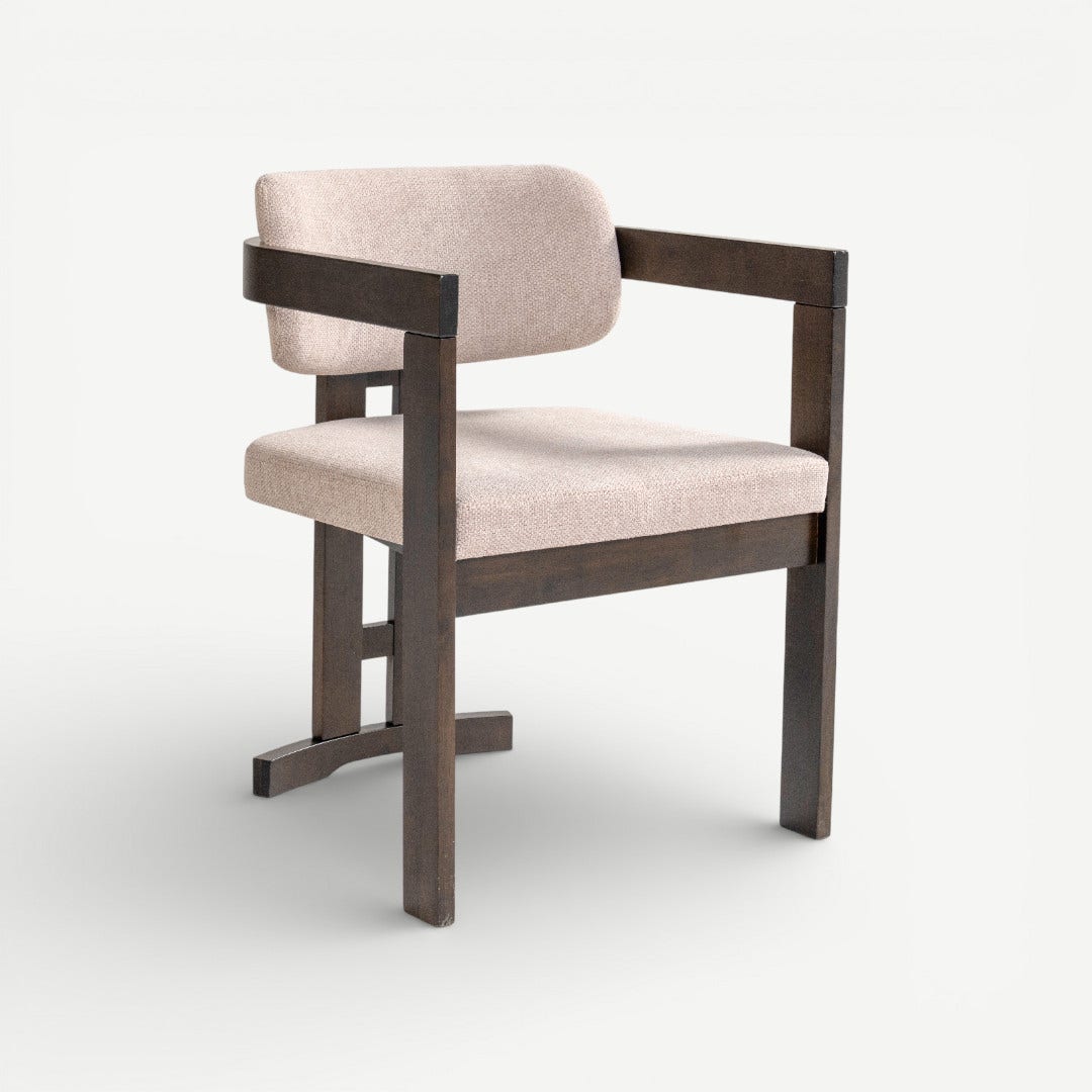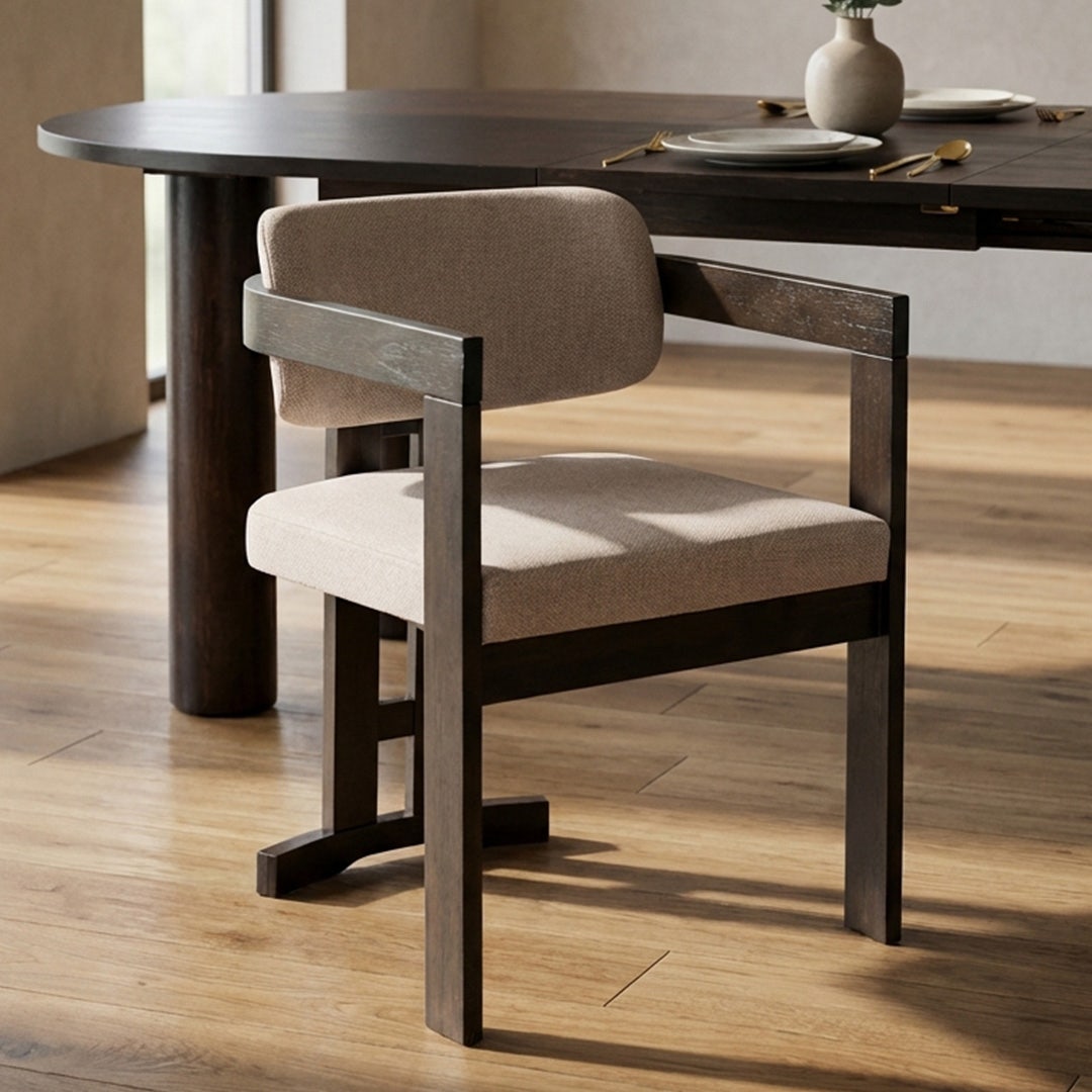 With its sculptural wooden frame and soft, tailored cushions, the Ingram Dining Chair brings a curated, gallery-inspired feel to your dining space. The dark rubberwood frame contrasts beautifully with the beige upholstery, creating a warm yet modern palette. Foam-filled cushions offer comfort, while the chair’s geometric construction gives your space a refined, intentional look.