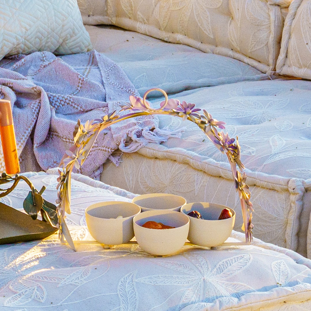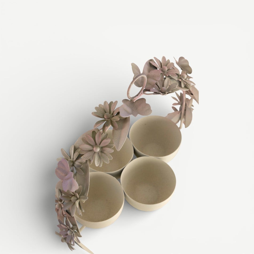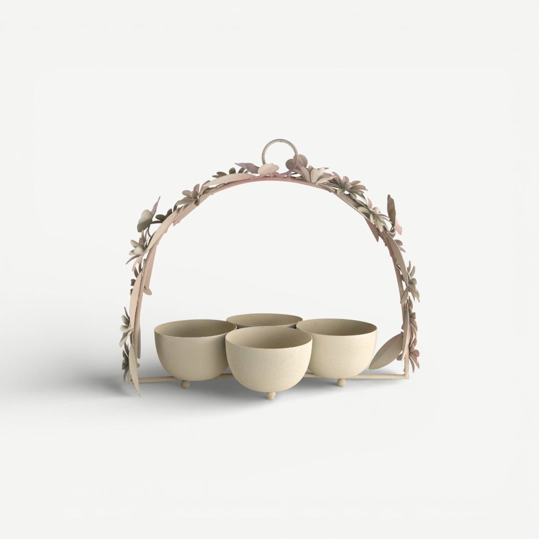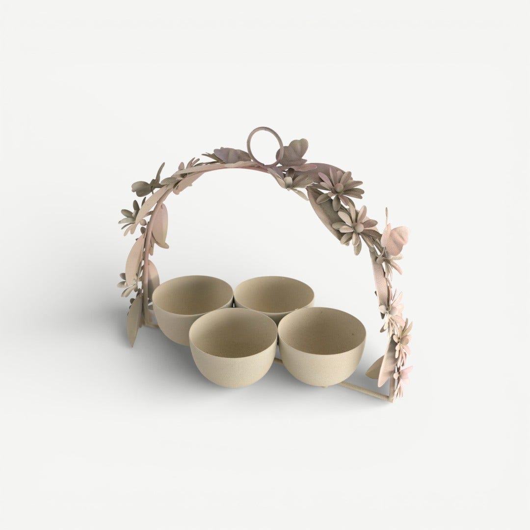 When everything is placed in one bowl, it blends. When each element has its own space, it feels chosen. The Leafy Dahlia Candy Bowl Set is designed around that idea. Four individual bowls keep contents separated and deliberate, while the arched handle gathers them into a single, liftable form. The floral detailing frames the set rather than competing with it, making the focus stay on what’s being shared, not the object holding it.