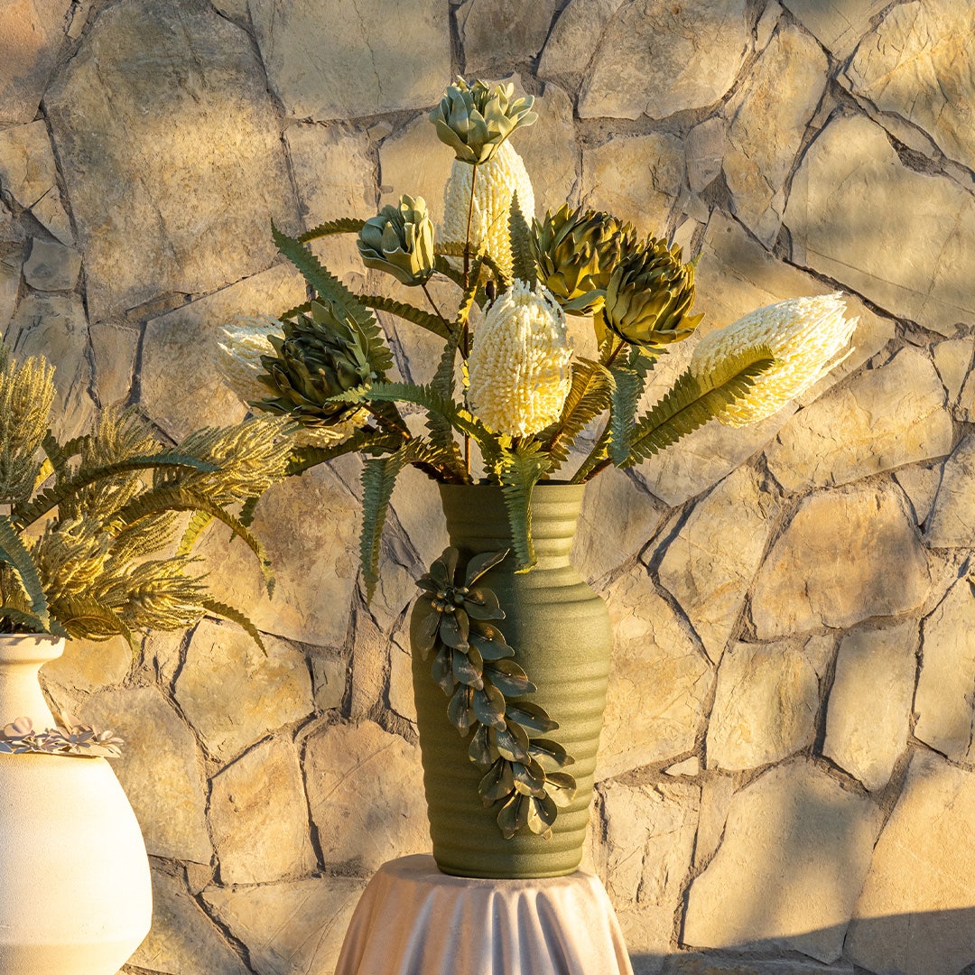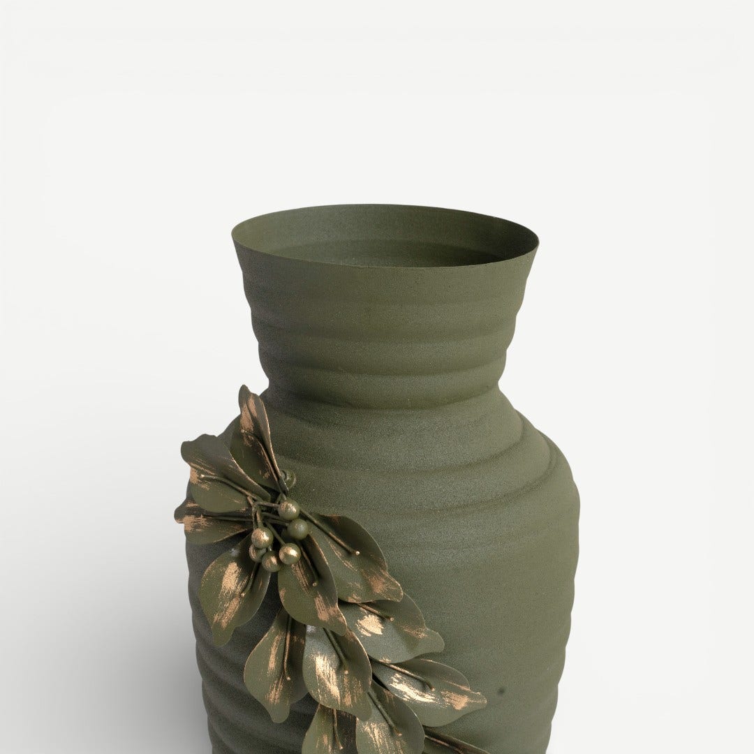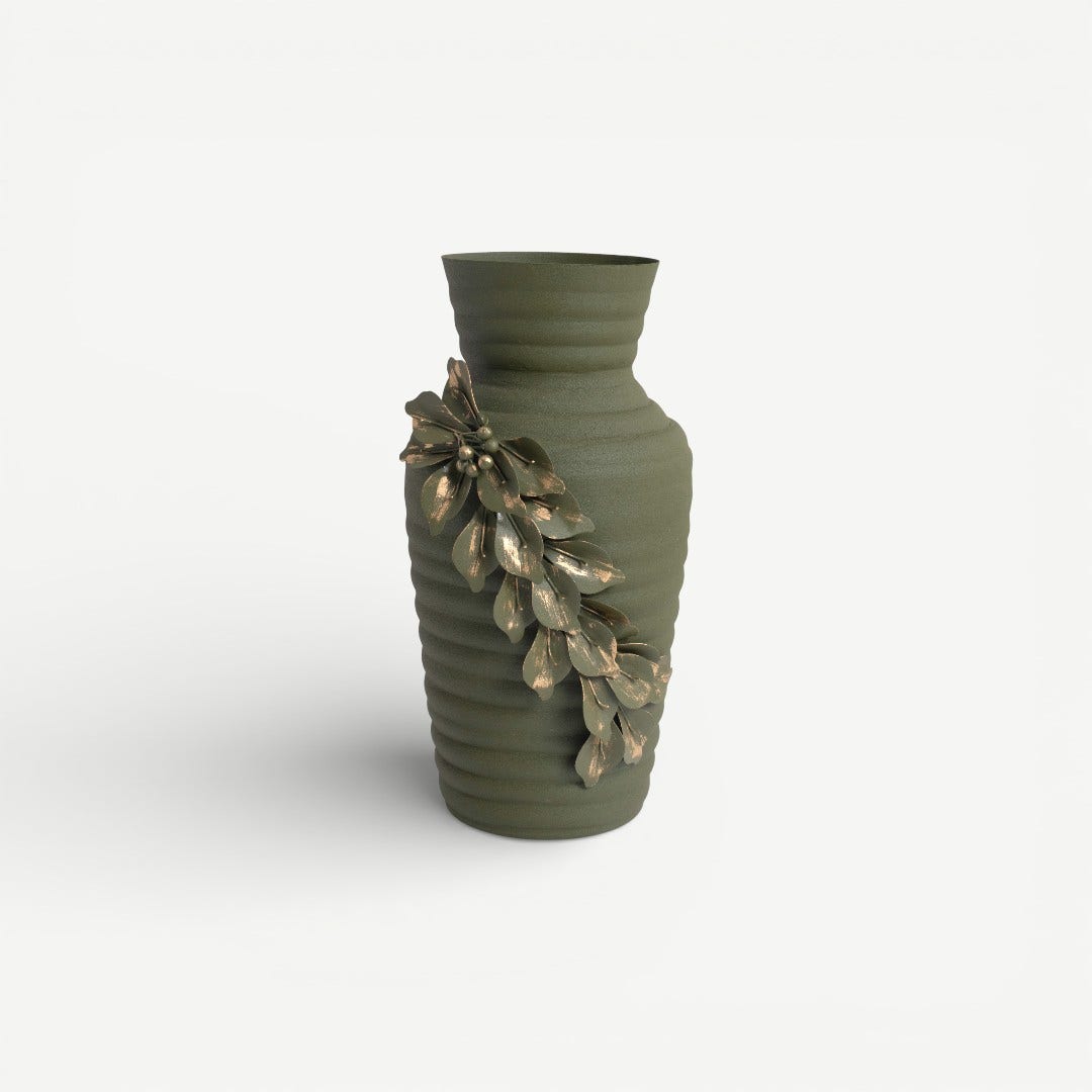 Infuse your tabletops with an organic, handcrafted feel using the Leafy Lily Decor Vase. This striking vessel features a deep olive-green finish with a unique ribbed texture, beautifully accented by a sculpted metallic leaf garland that drapes elegantly across its side.