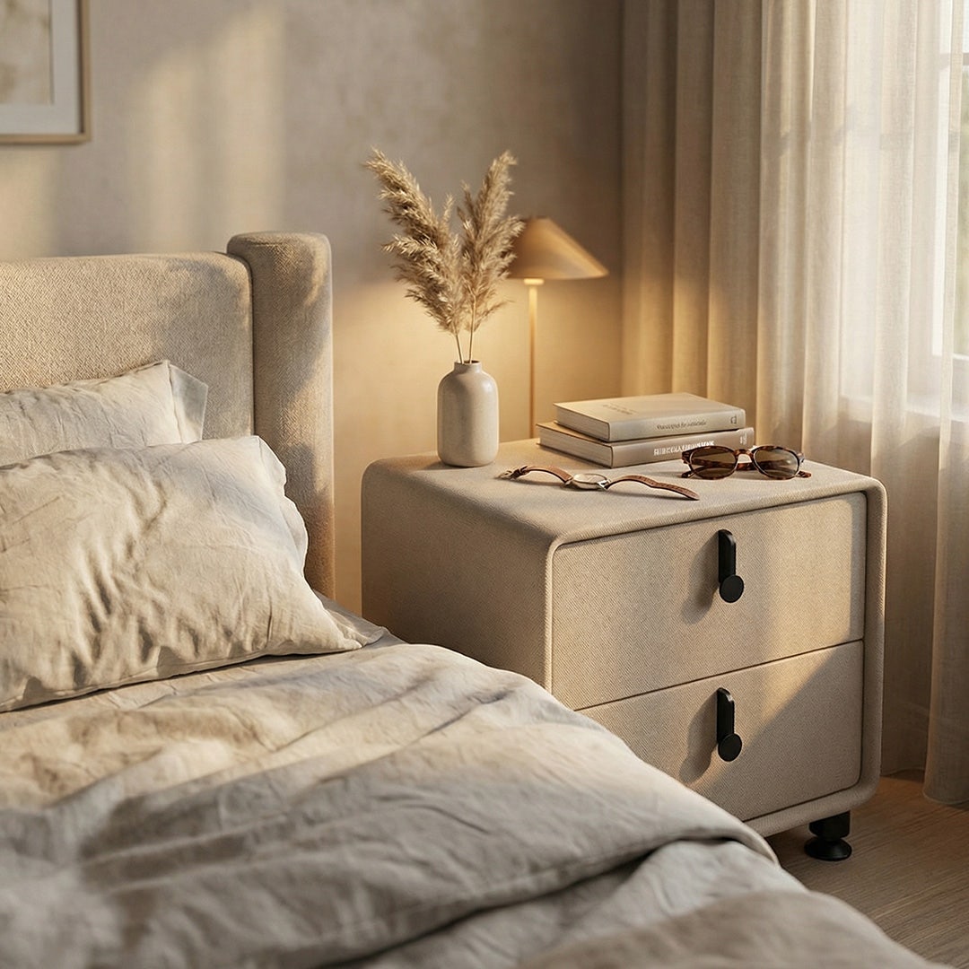 تجمع الطاولة الجانبية ليراس بين الأناقة العملية والسلاسة في الاستخدام. الأدراج المصنوعة من الخشب المضغوط مع نظام انزلاق ناعم تفتح وتغلق بكل سلاسة، وتصميم (PU) عالي الجودة يمنحها مظهر عصري مميز. الحواف المستديرة والمقابض باللون الأسود تضيف تباينًا جذّابًا بين المرونة والمتانة.