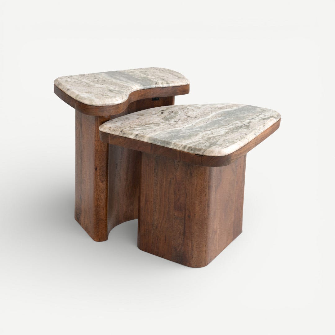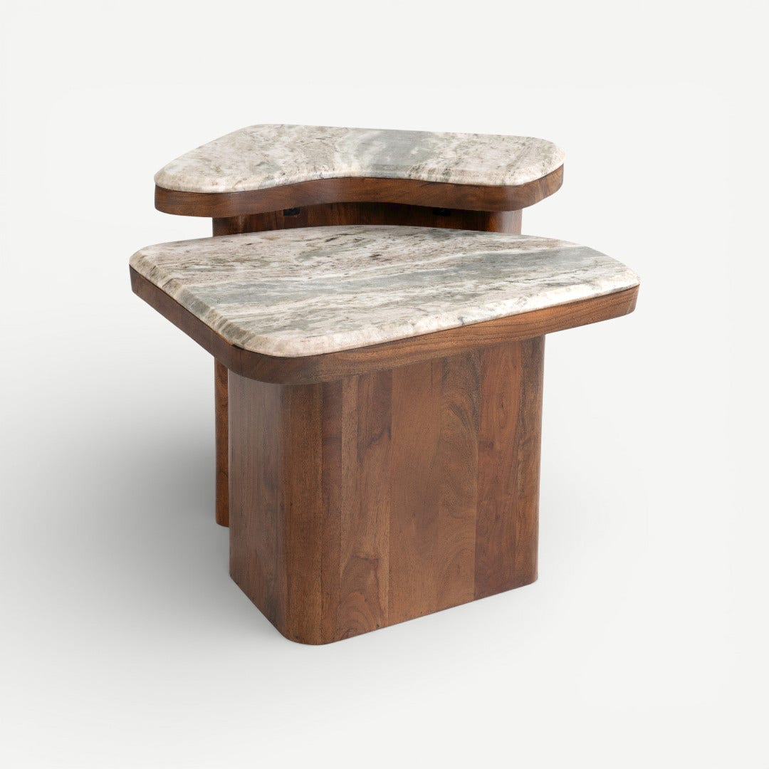 The Mashrabiya Coffee Table set is a sculptural dialogue of stone and wood. Redefine your living space with this Coffee Table Set, a duo that celebrates the raw beauty of the earth. Each table features a top of genuine marble, showcasing unique veining that ensures your set is a one-of-a-kind masterpiece. These cool, stone surfaces are cradled by warm, solid acacia wood bases, creating a sophisticated material contrast.