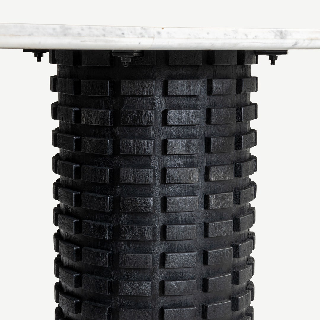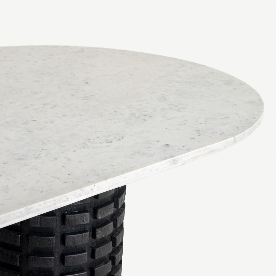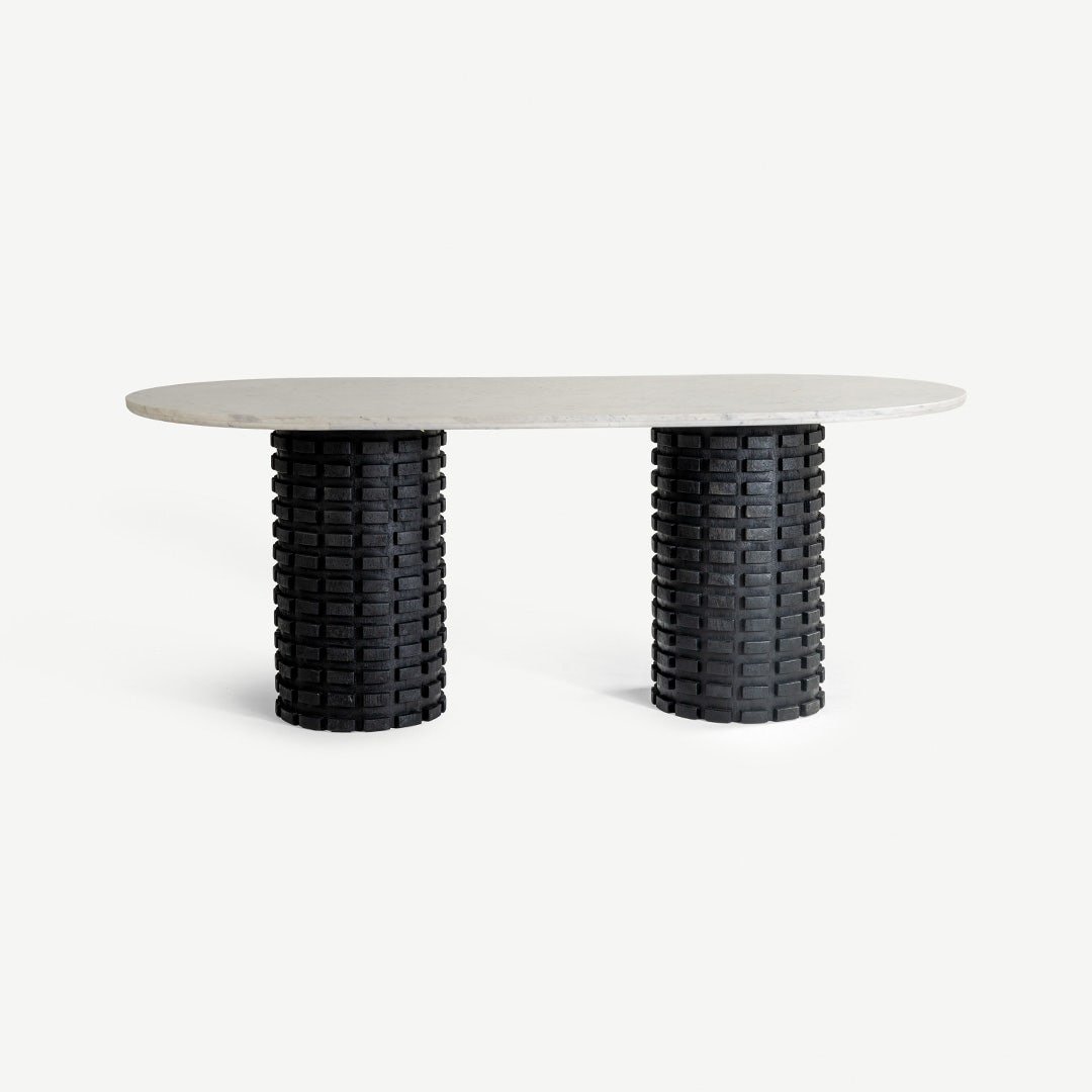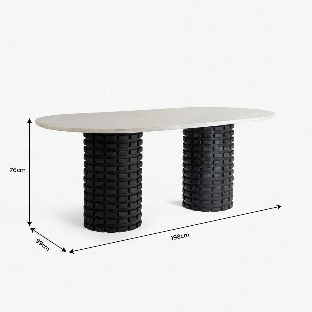 بطابع يجمع بين الفخامة واللمسة الطبيعة، تتألق طاولة الطعام ذات الستة كراسي ميرين بسطحها الرخامي الصافي وقاعدتها الخشبية الغنية بالملمس، لتبدو كعمل فني أكثر من مجرد طاولة. يرتكز سطحها البيضاوي من الرخام الأبيض بانسيابية على قاعدتين أنيقتين من خشب المانجو، في انسجام يعبّر عن التوازن بين القوة والجمال. * قاعدتان مصنوعتان يدويًا من خشب المانجو المنحوت * تتسع لستة أشخاص بطريقة مريحة * سطح رخامي طبيعي بتعرّقات ناعمة وانسيابية * تفاصيل منحوتة فريدة على القواعد الأسطوانية