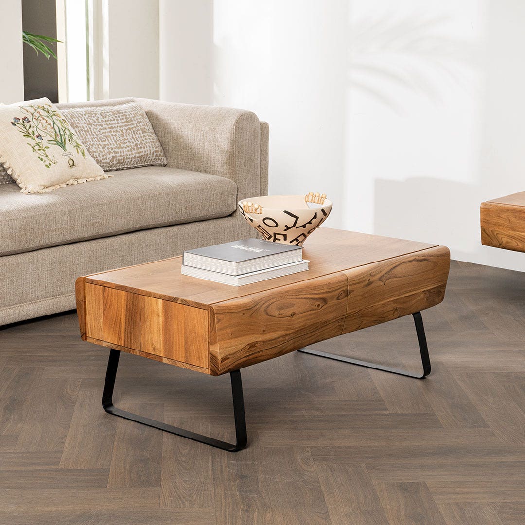 Coffee, snacks, magazines, remote controls – you name it, the Avien Center Table has you covered. Crafted in sturdy acacia wood and MDF. Those sleek drawers are perfect for keeping clutter out of sight so you can maintain your chill. And with its bold black legs and natural wood finish, it easily fits into any room.