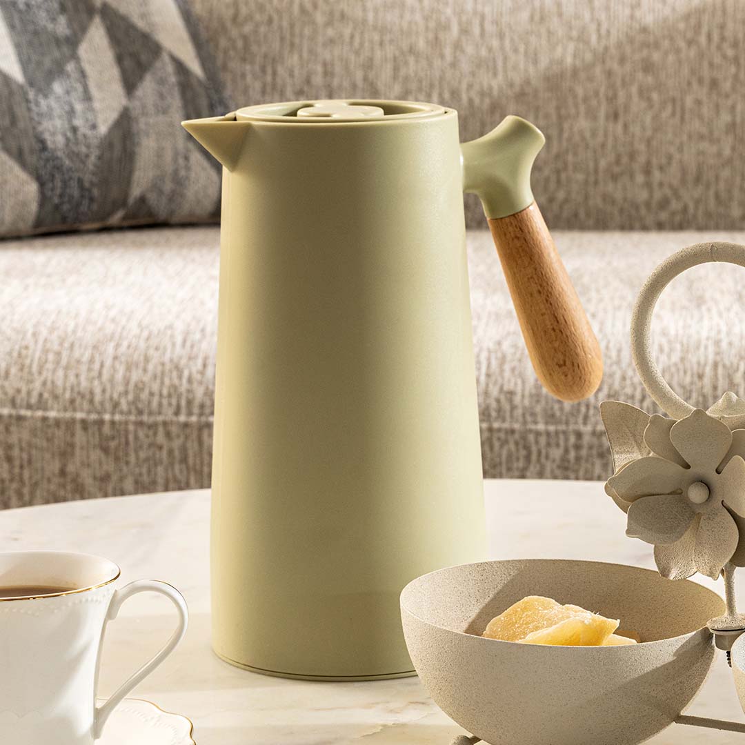 A tall, streamlined form wrapped in a soft pastel green finish gives this flask a contemporary presence. The surface is smooth and understated, with the gently angled spout and fitted lid keeping the design clean. A wooden handle adds warmth and contrast, introducing a natural touch that balances the refined structure.