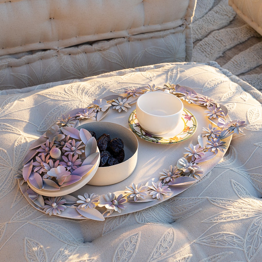 The Leafy Dahlia Serving Tray is built with a framed beauty. Its centre is deliberately calm and uninterrupted, giving space for objects to sit in style, while the floral detailing is pushed to the perimeter, doing its work quietly at the edges.