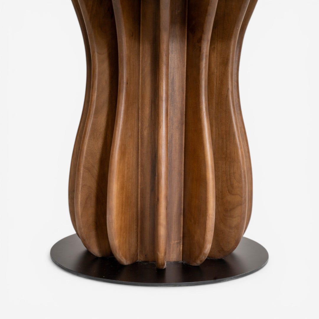 - A sturdy pedestal crafted from individual vertical mango wood slats, offering a textured look and plenty of legroom.