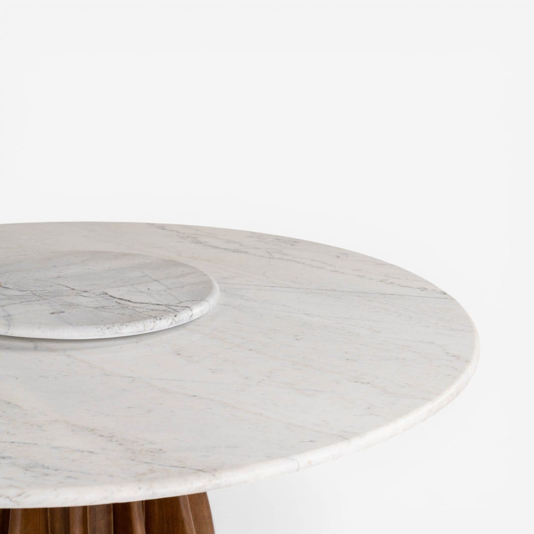 Big family dinners are much easier when the food is within everyone's reach. The Ragnar dining table is designed for exactly that, featuring a built-in rotating marble center that makes sharing dishes feel effortless. It’s a thoughtful piece that combines a bright, airy marble top with a warm wood base, creating a space where the conversation and the food can keep flowing.
