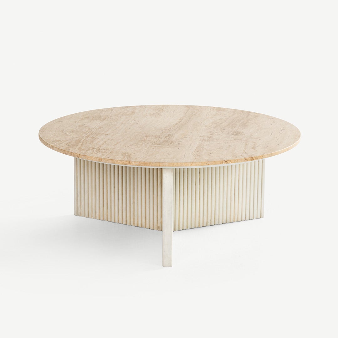 Featuring a luxurious travertine top and a sleek round shape, the Salem centre table is the perfect spot for gathering around with friends and family. Supported by a sturdy wooden base, it's functional and stylish, making it a must-have addition to your living space.