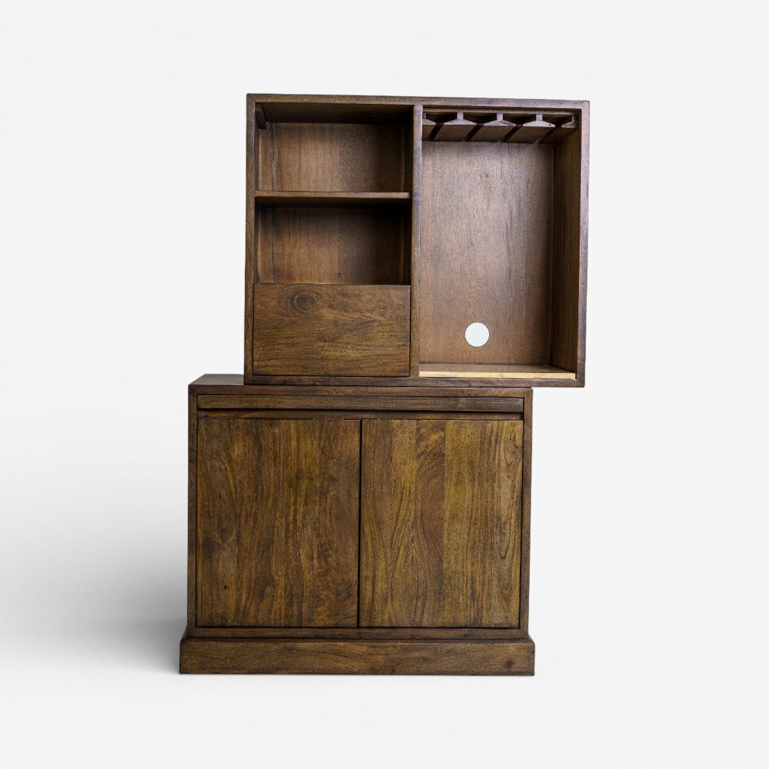 The Vogue Coffee Cabinet is designed to elevate everyday rituals with a refined blend of natural materials. Warm mango wood forms a rich, organic base, while a travertine top introduces cool texture and subtle variation. The contrast creates a balanced, grounded presence, making it an ideal focal point for a dedicated coffee or wine station.