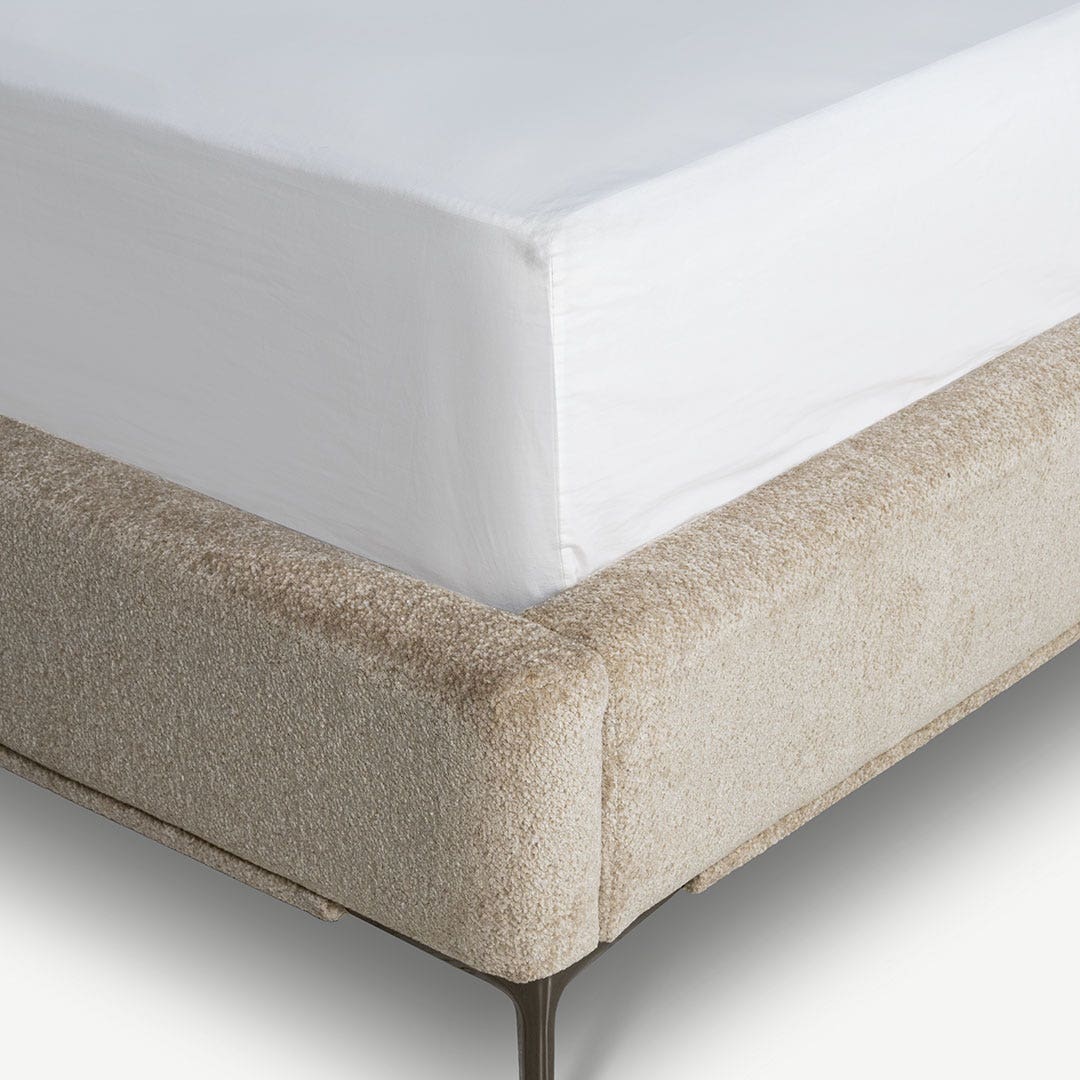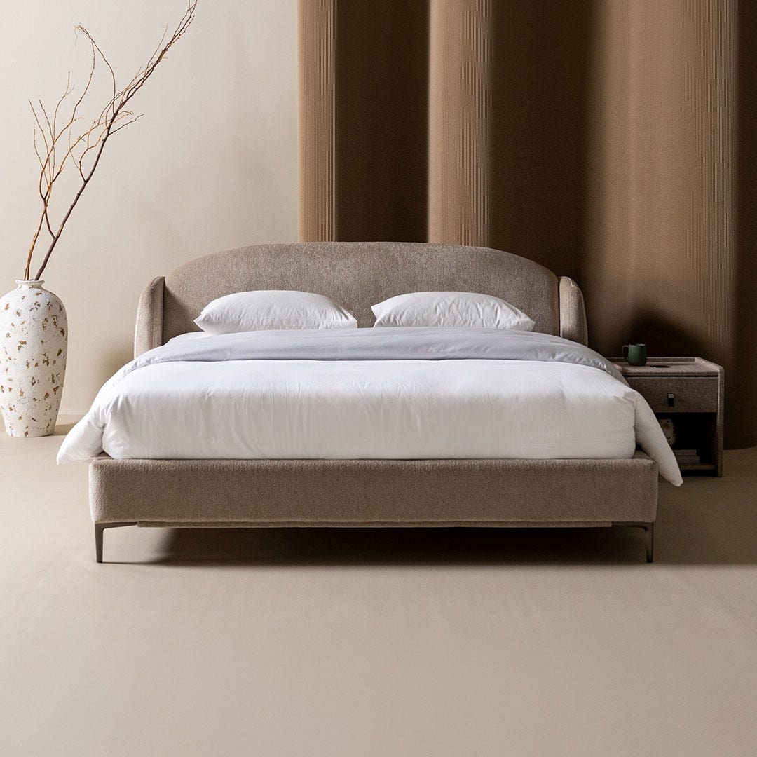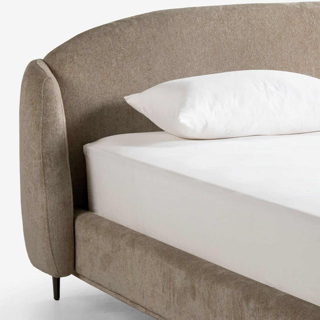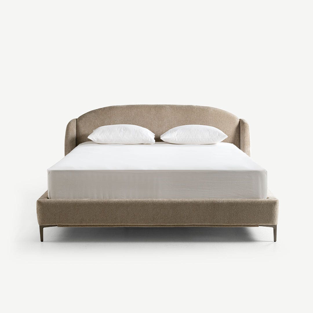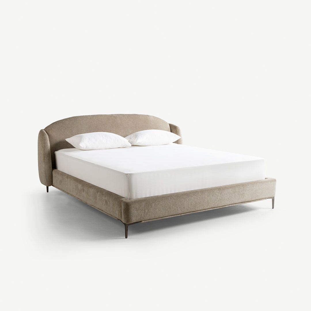 Soft textures and a sleek, curved headboard make this bed your go-to spot for relaxing. The slim metal legs add a modern vibe while keeping things airy. It’s comfy, stylish, and just what you need to complete your bedroom.