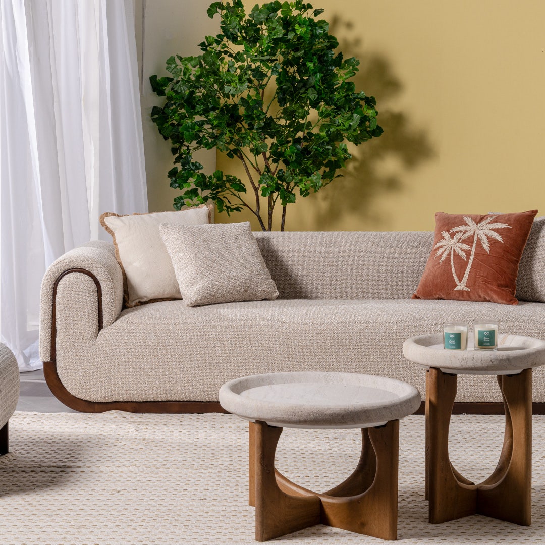 كنبة بثلاثة مقاعد واسعة بتنجيد ناعم باللون البيج توفر راحة مثالية للاسترخاء أو اللقاءات في غرفة المعيشة. تصميمها بخطوط نظيفة يتيح تنسيق سلس وأنيق مع الوسائد الأربعة المرفقة، لتضفي جوًا من الرقي والراحة على المساحة.