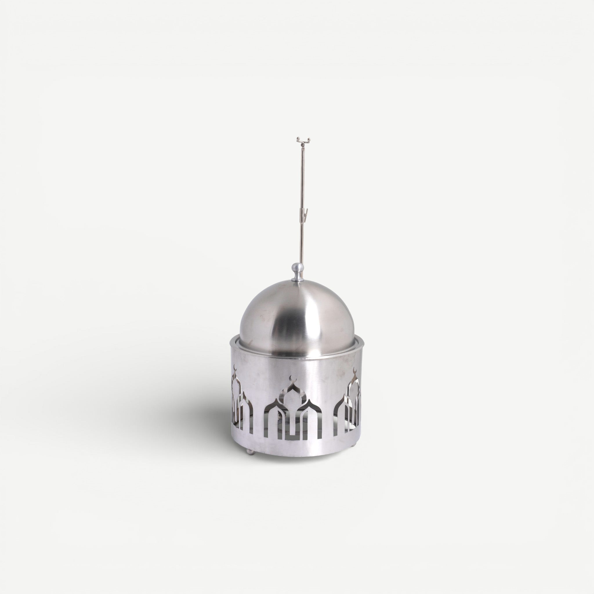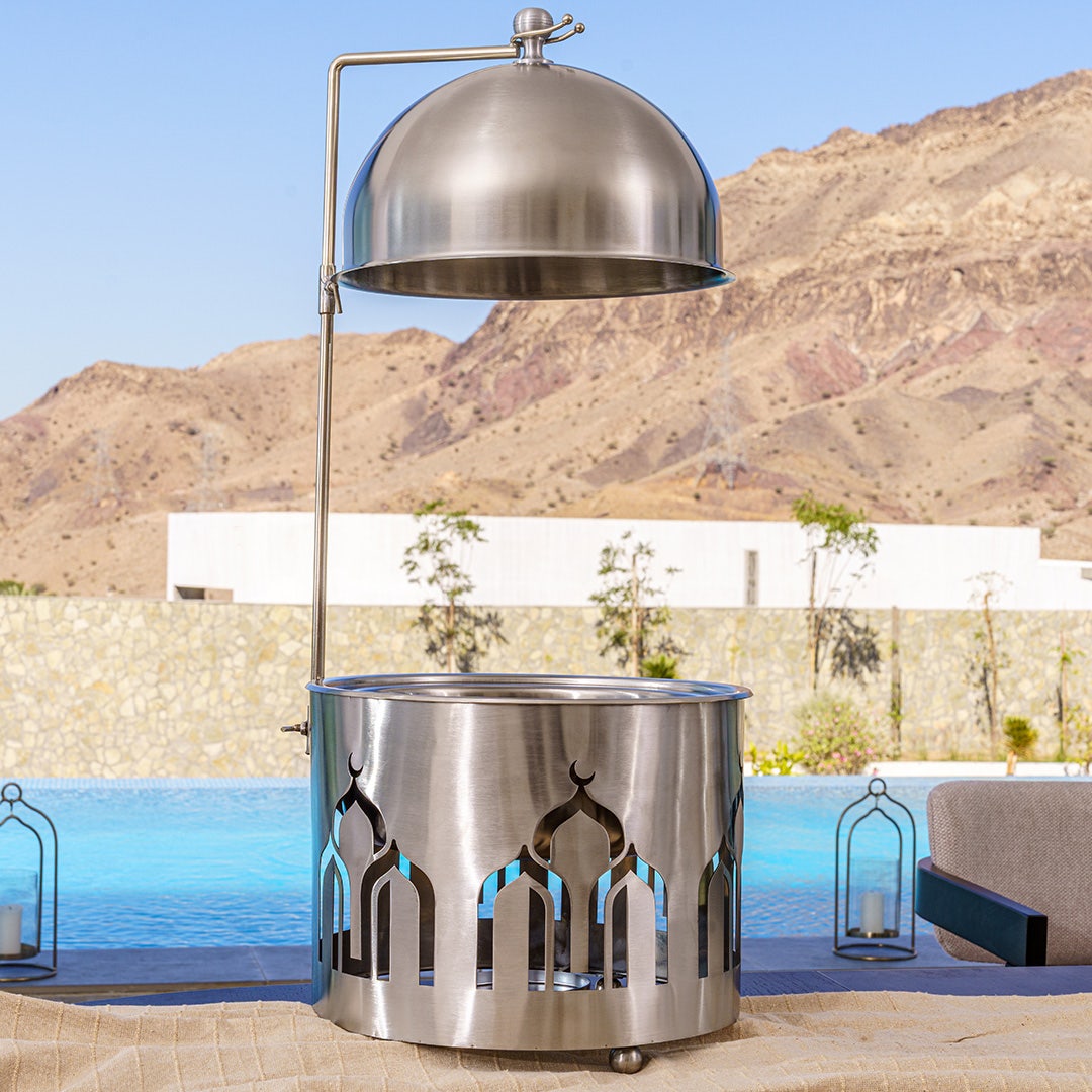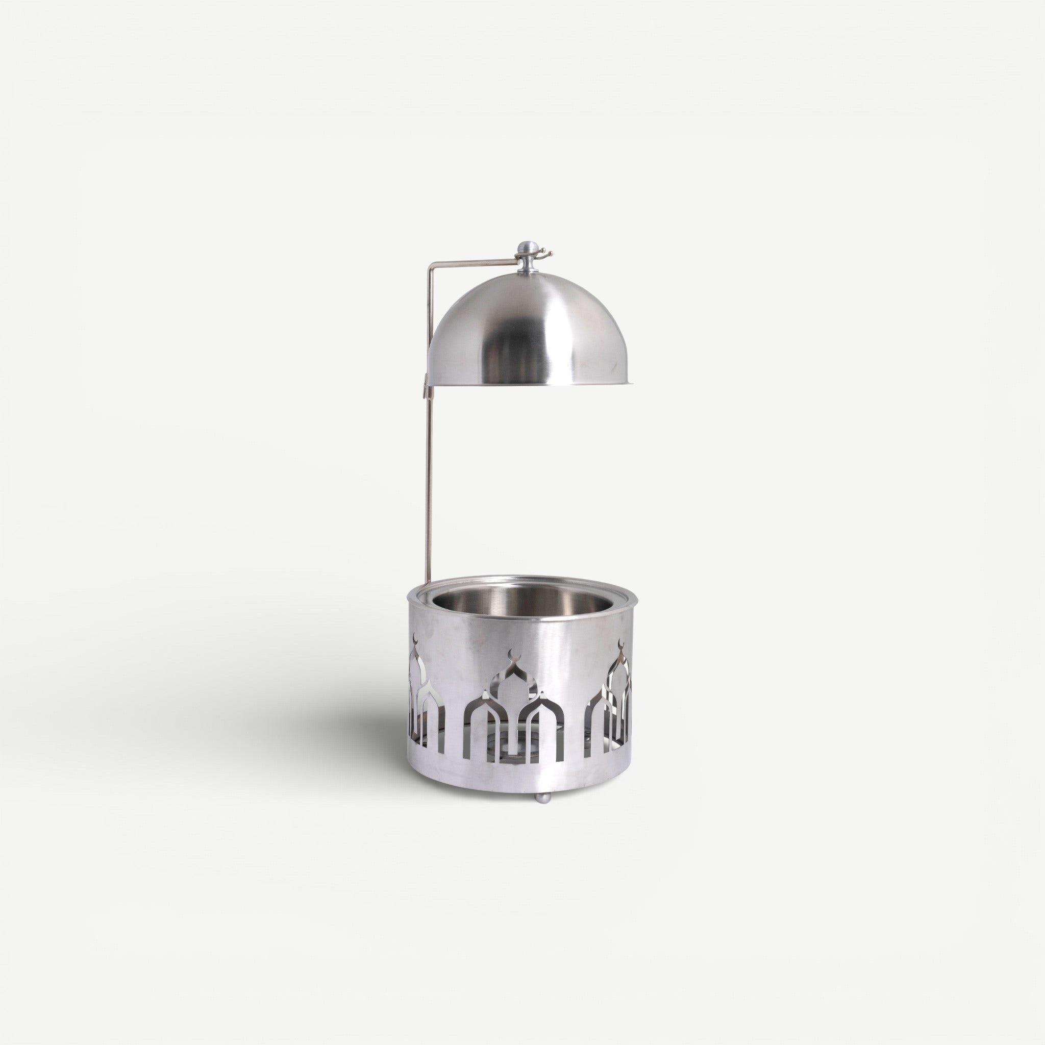A stunning intersection of architectural design and culinary ritual. Crafted from high-polish stainless steel, this 4-liter Chafing Dish features a distinctive cylindrical base with laser-cut arched windows, reminiscent of classical regional architecture. It serves as a celestial tribute during traditional holidays, maintaining a sleek, minimalist profile that fits perfectly in a modern home.