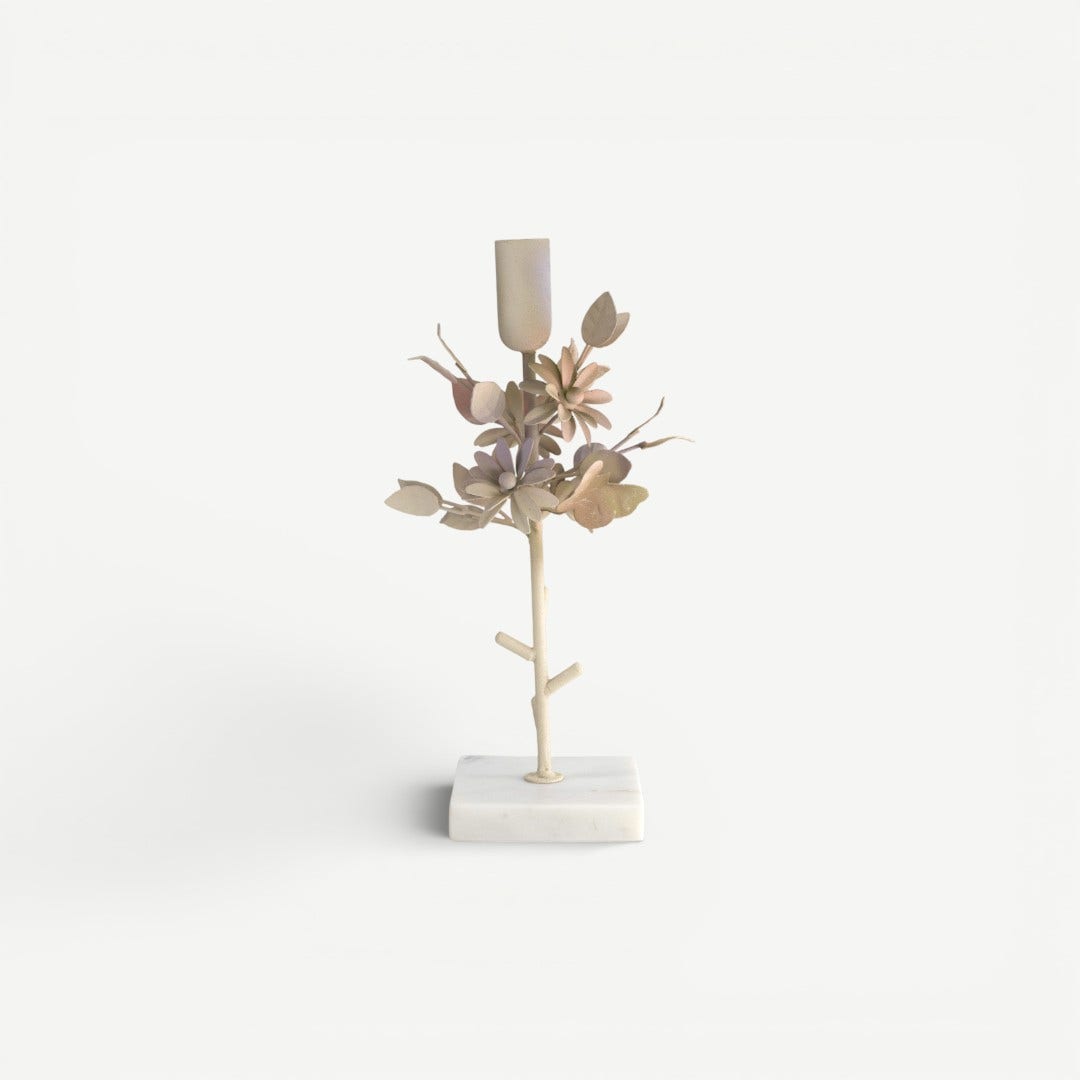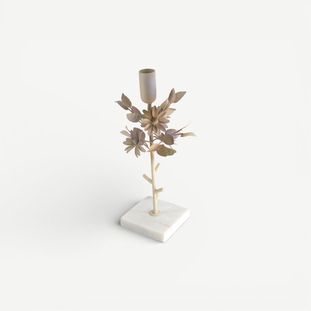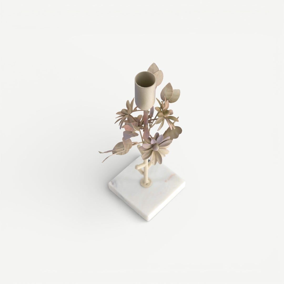 The Leafy Dahlia Candle Holder at 25 cm claims that light belongs to its surroundings. The compact height brings the flame closer to what matters most, the objects and people around it, while the iron stem and marble base ensure it doesn’t feel fragile in use. The floral detailing is not ornament for ornament’s sake; it provides a visual anchor so the piece reads as intentional, even in smaller spaces.