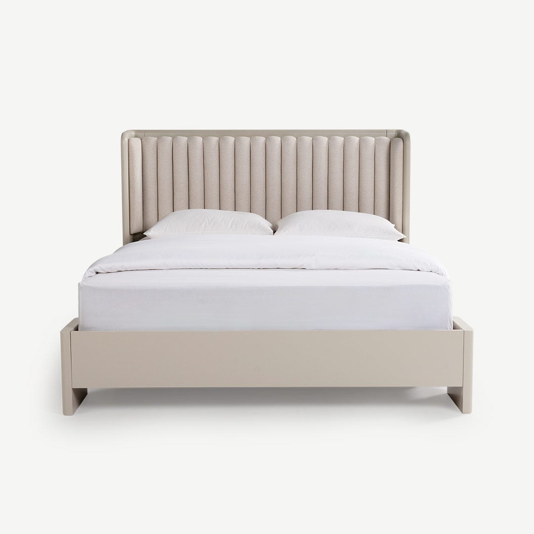 يتميّز سرير لوسياس كوين بمسند رأس مبطّن بتقسيمات عمودية أنيقة، ولمسات ناعمة على الإطار تضيف توازنًا بين الراحة والرقي. تصميم اللوح السفلي المنخفض والقاع المفتوح يمنح السرير طابعًا انسيابيًا وإحساس بالرحابة في الغرفة.