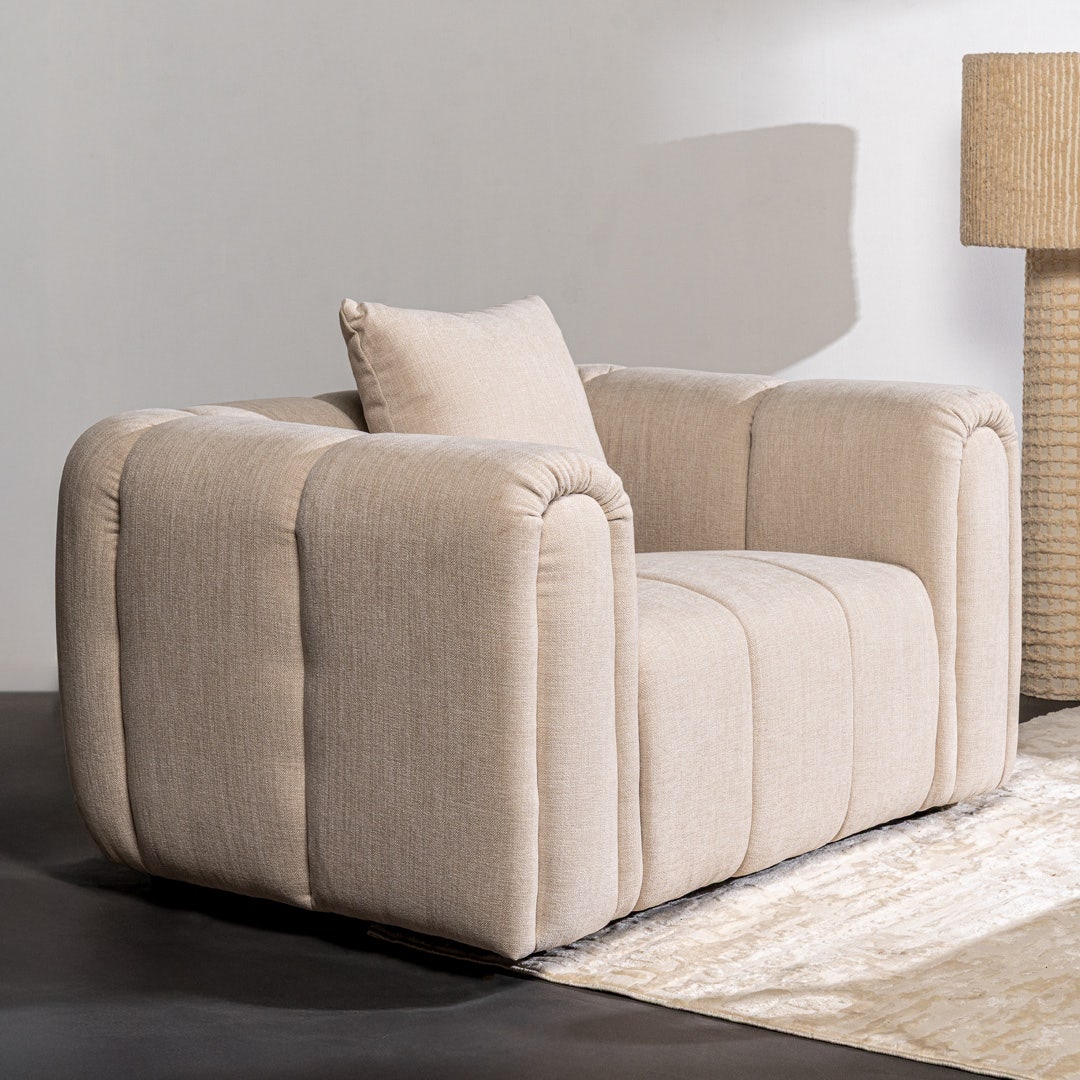 تجمع الكنبة الفردية نيرلا بين الانحناءات الناعمة والحجم العصري، لتقدم مظهرًا مبطنًا وفخمًا مع أذرع مستديرة ومقعد عميق يوفر راحة فائقة. مغطاة بقماش بيج ناعم وسهل التنسيق، ومبنية على إطار خشبي متين، لتمنح هذه الكنبة الفردية طابعًا فاخرًا وأنيقًا يثري أي مساحة معيشة. * كنبة فردية بتصميم عصري مبطن وفاخر. * مقعد وأذرع عميقة مبطنة لراحة غامرة. * إطار خشبي متين لضمان الاستدامة. * تأتي مع وسادة ظهر مطابقة.