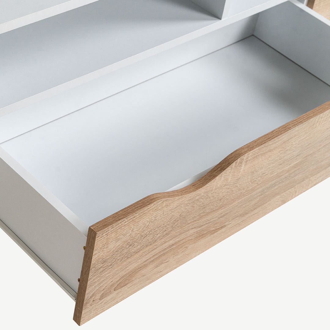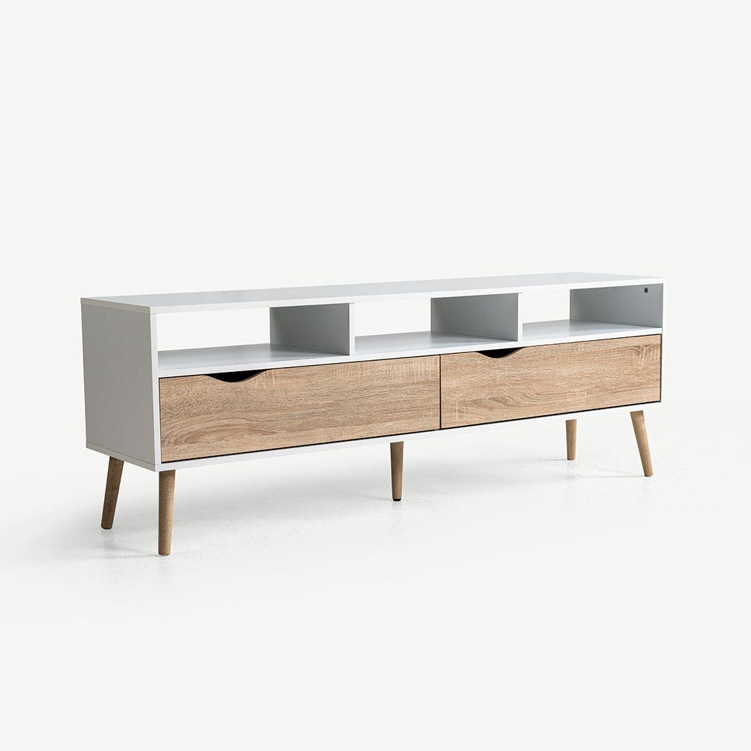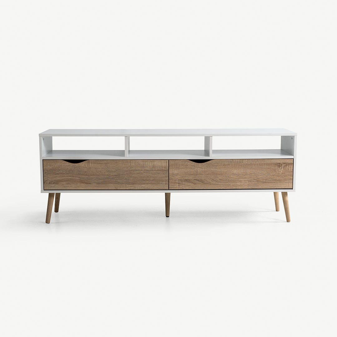 With a minimalistic design and practical storage, this piece keeps your space tidy and stylish. Open compartments let you showcase your favorite media gadgets, and the roomy drawers handle the clutter. The TV unit is supported by sturdy wooden legs.