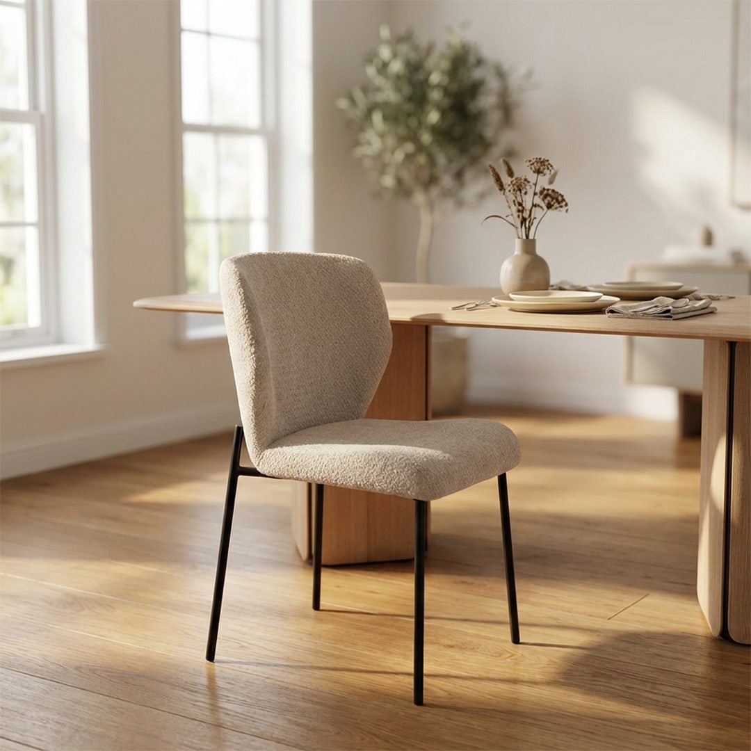 تتحوّل وجبات العشاء الطويلة والفطور الهادئ إلى لحظات أكثر راحة مع كرسي الطعام تويلان. يتميز بمسند ظهر منحني ومقعد مصمم بانسيابية، كلاهما مبطّن بخفة ومغطى بقماش ناعم ومتين يمنحك دعمًا مريحًا دون التضحية بالأناقة. القوائم المعدنية الرفيعة باللون الأسود تضيف لمسة عصرية بسيطة، ما يجعل تويلان ينسجم بسهولة مع مختلف ديكورات غرف الطعام.