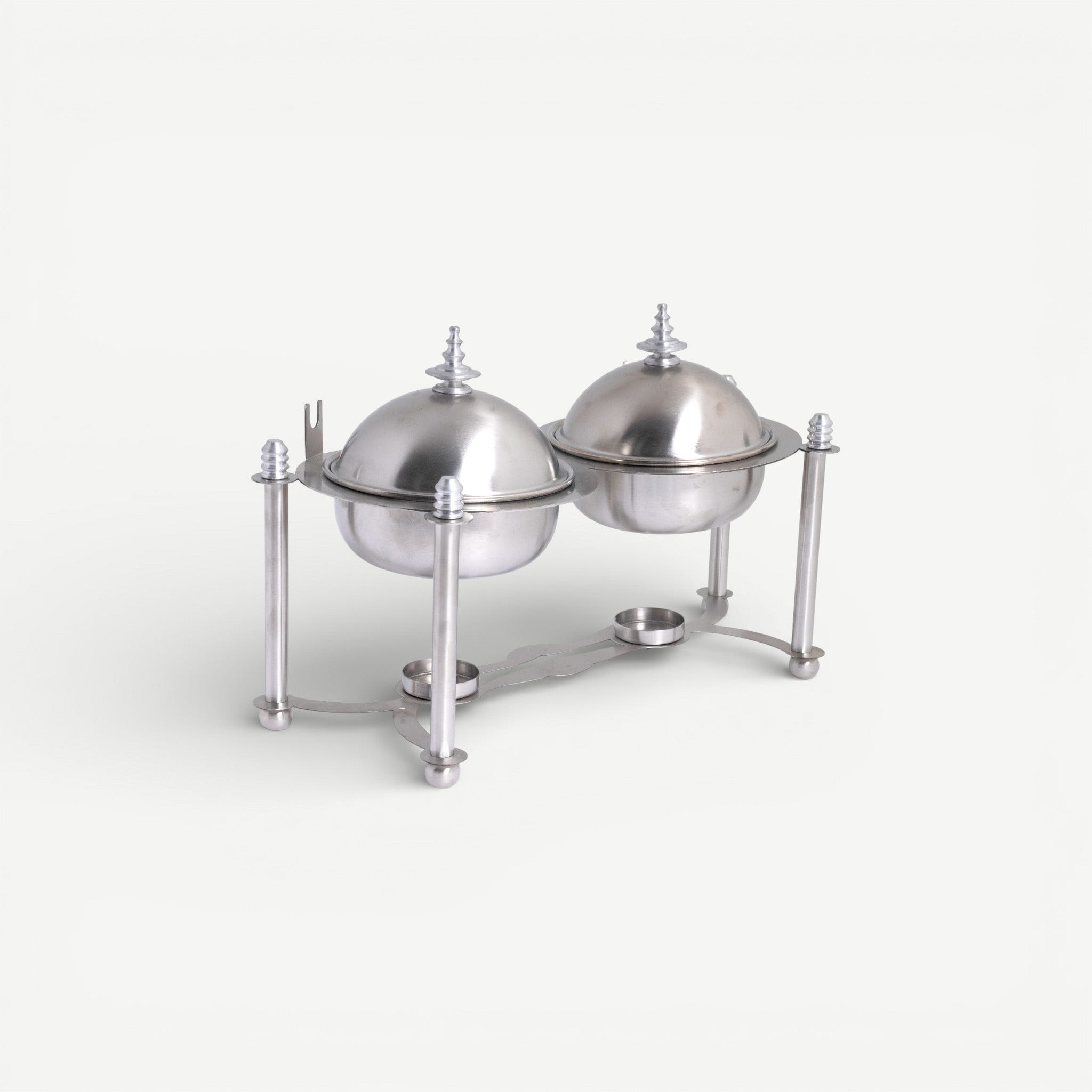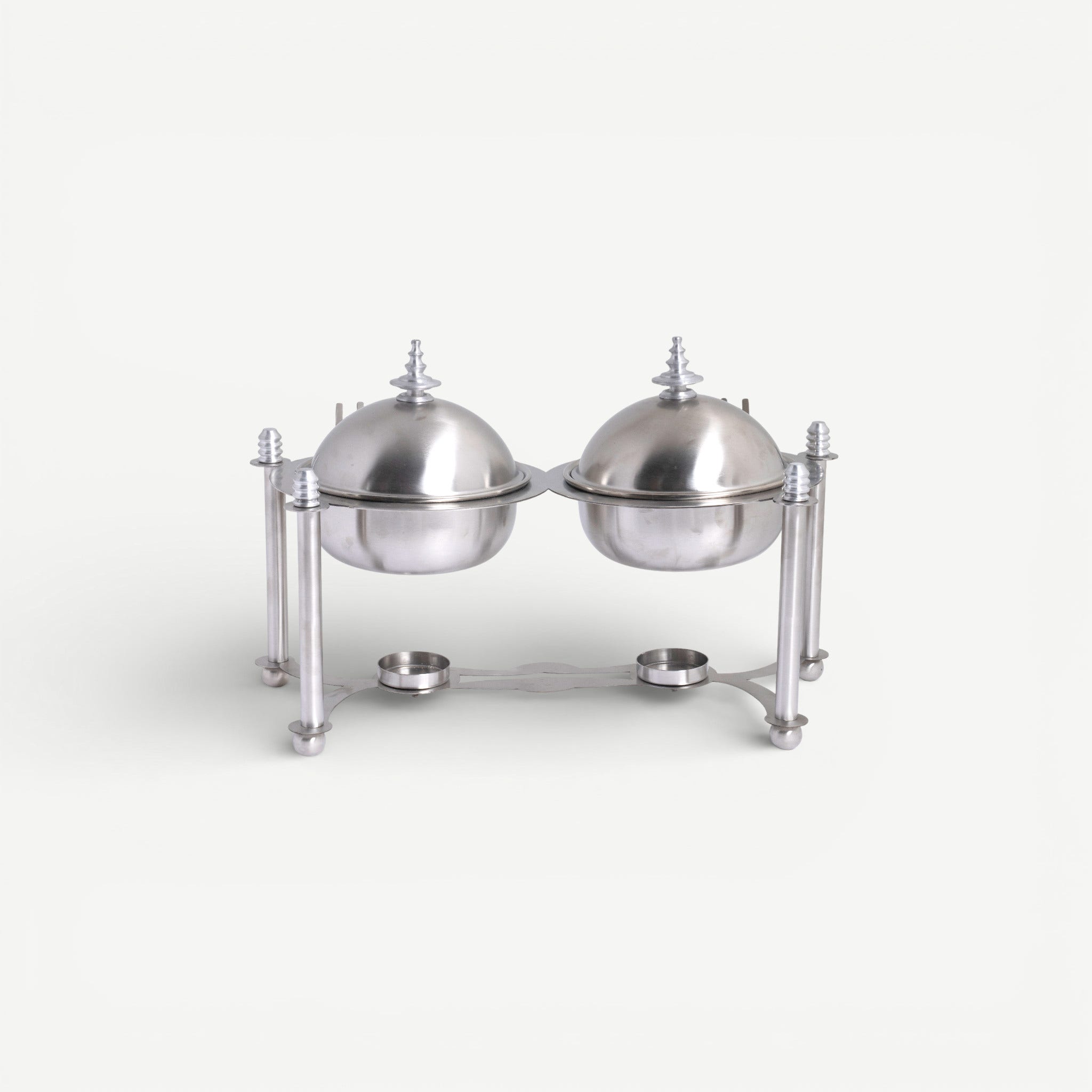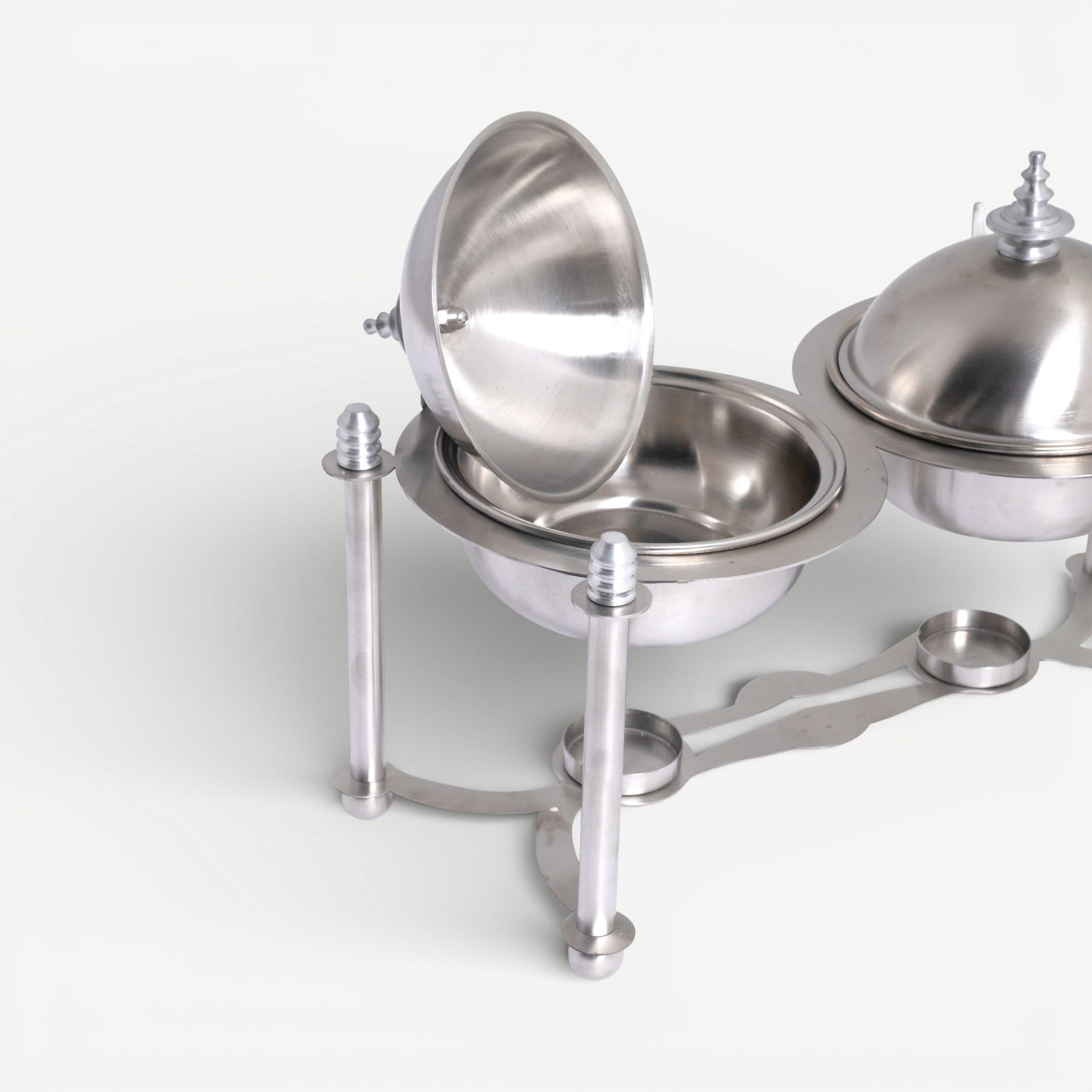 Refined performance for effortless entertaining. Designed for large family gatherings and festive buffets, the Vogue Chafing Dish Set ensures your culinary creations remain at the perfect serving temperature. The unit is supported by a sturdy six-leg frame with orb-footed detailing, providing both stability and protection for your table linens. Below each basin, integrated fuel holders provide consistent heat, while the dome lids are topped with decorative tiered finials, adding a touch of classic ceremony to its modern silhouette.