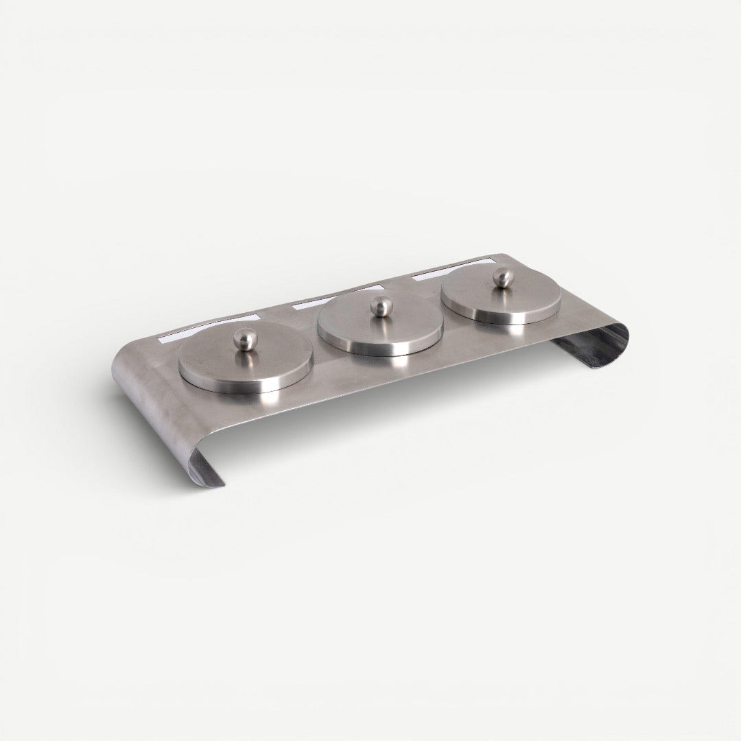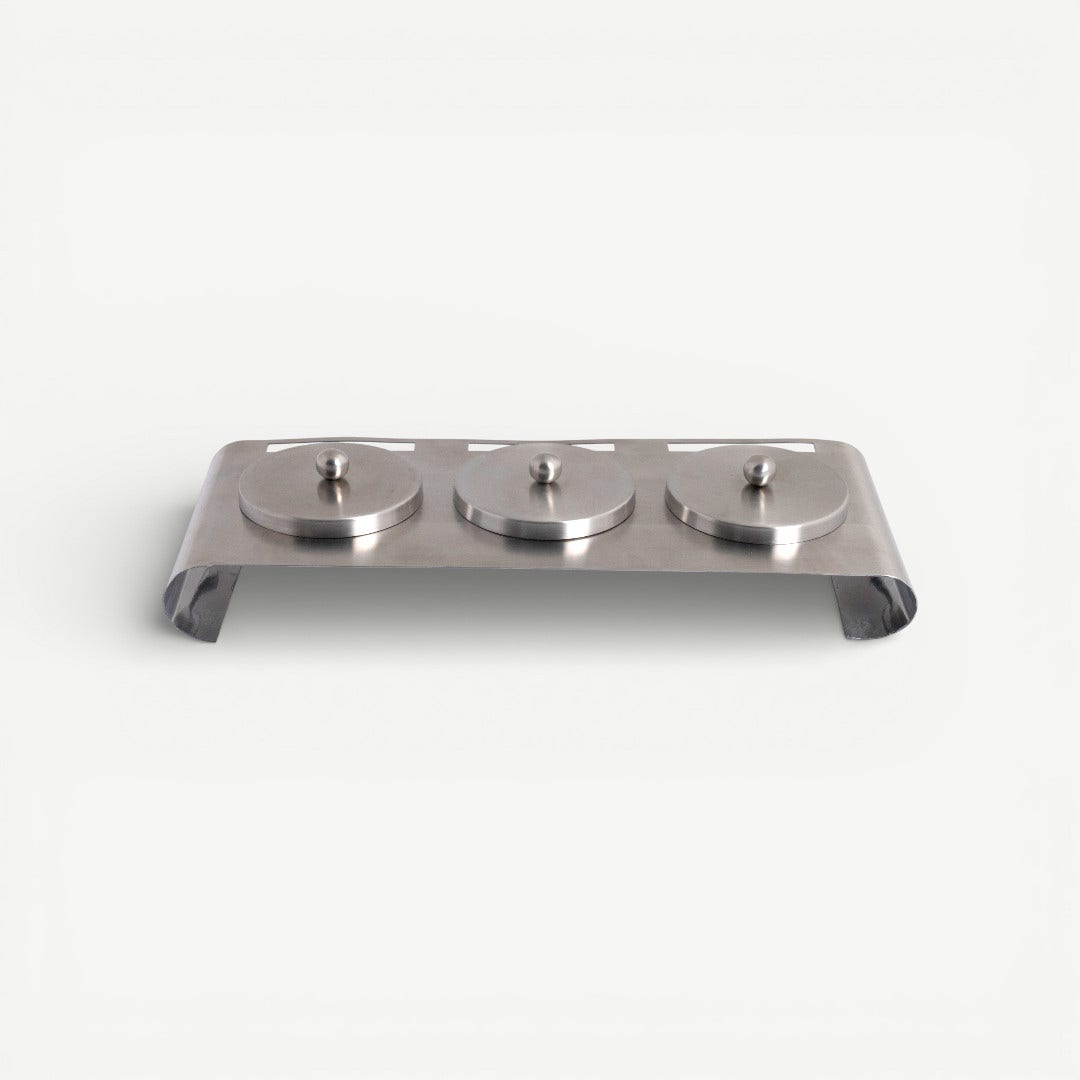 This 48cm long Snack Bowl Set features a clean-lined wooden base that brings an organic, grounded element to your tabletop. Nestled within this warm frame are three brushed-silver bowls that provide a cool, industrial contrast, creating a balanced aesthetic that feels both professional and inviting.