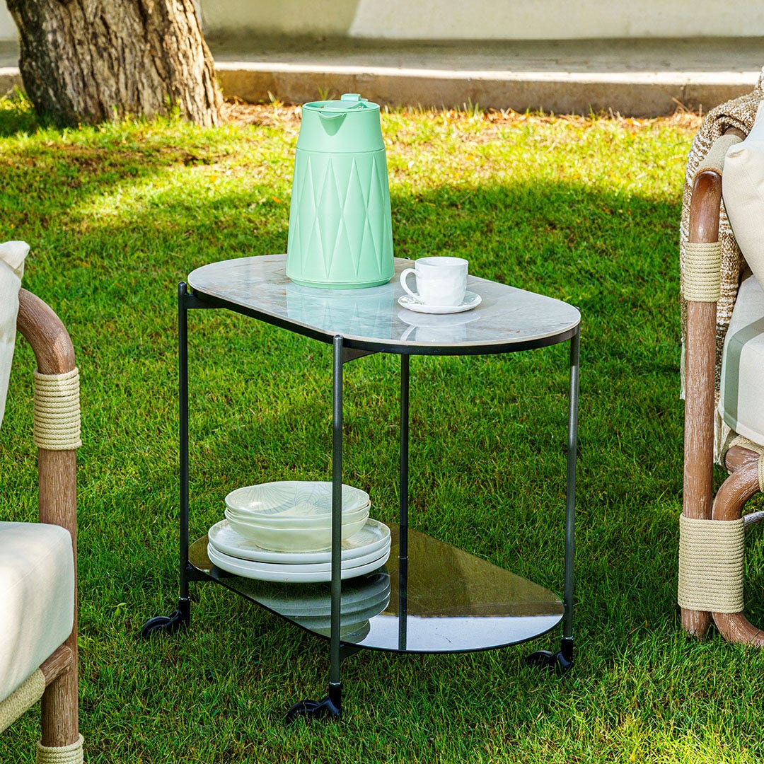 طريقة أنيقة وعملية لتقديم المشروبات والوجبات الخفيفة، أو لإضافة مساحة مرنة تليق بذوقك. ويستفيلد هي عربة التقديم المثالية لإنجاز هذه المهمة بلمسة من الرقي. تجمع في تصميمها بين إطار معدني باللون الأسود وخطوط ناعمة وانسيابية، مع مقابض بسيطة تُسهّل الحركة والتنقل. تضم رفّين بيضاويين بتصميم فريد: علوي من السيراميك الفاخر لتقديم المشروبات والمقبلات بأناقة، وسفلي من الزجاج الشفاف لحمل القوارير أو الأدوات الإضافية. يتحرك بسهولة وانسيابية، ليكون رفيقك العملي في كل جلسة وضيافة.