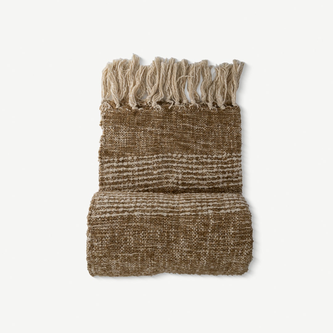 Feel the luxury of handmade craftsmanship with the Atina handloom-woven throw. The rich texture and subtle natural tones of this cozy sofa throw bring warmth to your room, the kind of effortless beauty that makes your home feel lived in, loved, and inviting. Handwoven from a premium cotton-viscose blend, the throw drapes beautifully across your favorite chair or the edge of your bed. The earthy color palette and soft tassels create a tactile experience that soothes the senses while elevating your interior style. Perfect for cozy nights, relaxed mornings, or that finishing touch that ties your space together.