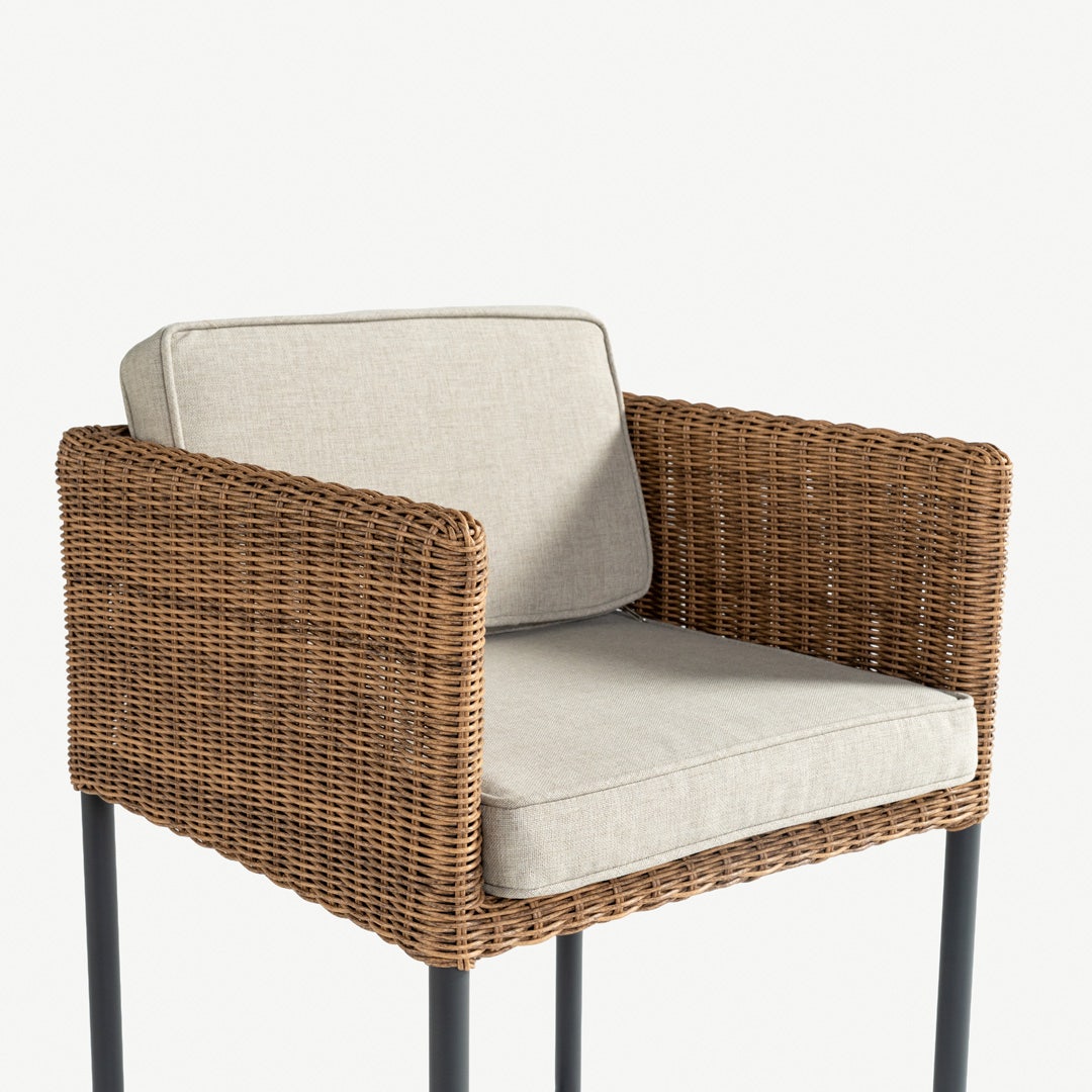 The Aveline Rattan Bar Chair with the tactile natural weave, smooth metal framework, and soft performance fabric, all crafted to elevate outdoor spaces. The bar chair’s round rattan form lends texture and warmth, and the Olefin cushions deliver plush, resilient comfort that resists UV exposure, water, and stains. Built on a slender powder-coated metal base it is a statement of modern outdoor luxury. * Cushions in Olefin performance fabric (fade, water, and stain-resistant) * Metal legs with powder-coated finish for weather endurance