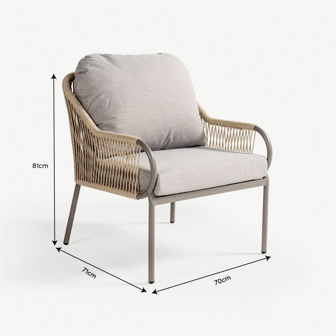 A stylish yet resilient foundation for relaxed gatherings under the sky, the Halo sofa set in Beige 4-piece. Built with a sleek metal frame wrapped in woven rope and plush fabric cushions, this sofa set blends the beige shade, which harmonises with natural surroundings or minimalist décor. The rope and metal contrast gives it visual interest that stands out, while the beige tone keeps things grounded and versatile.