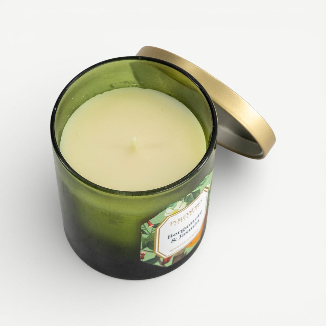 Bright, citrusy bergamot meets the soft, lingering sweetness of jasmine in this balanced everyday fragrance. Housed in a deep forest-green glass jar with a brushed gold lid, it is designed to look as beautiful on a side table as it smells in the air. The translucent glass catches the light when lit to create a warm, moody glow, while the metallic lid keeps the wax pristine between uses. It is the kind of quiet detail that makes a room feel instantly more lived-in and complete.