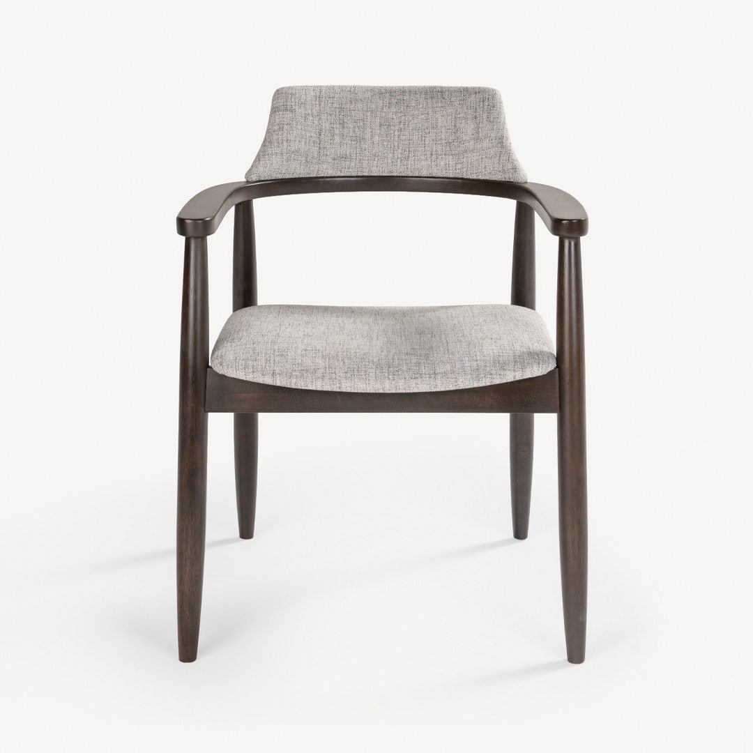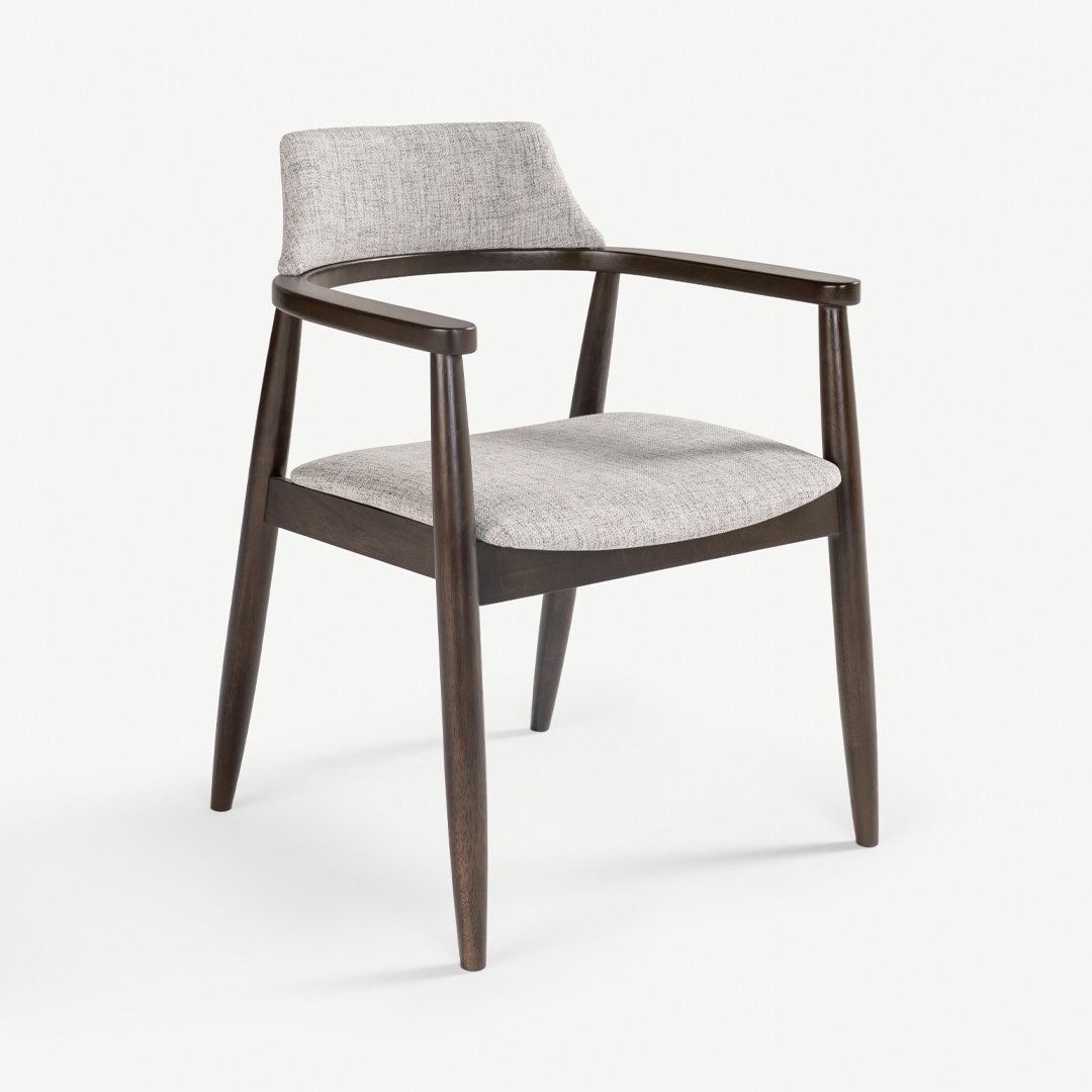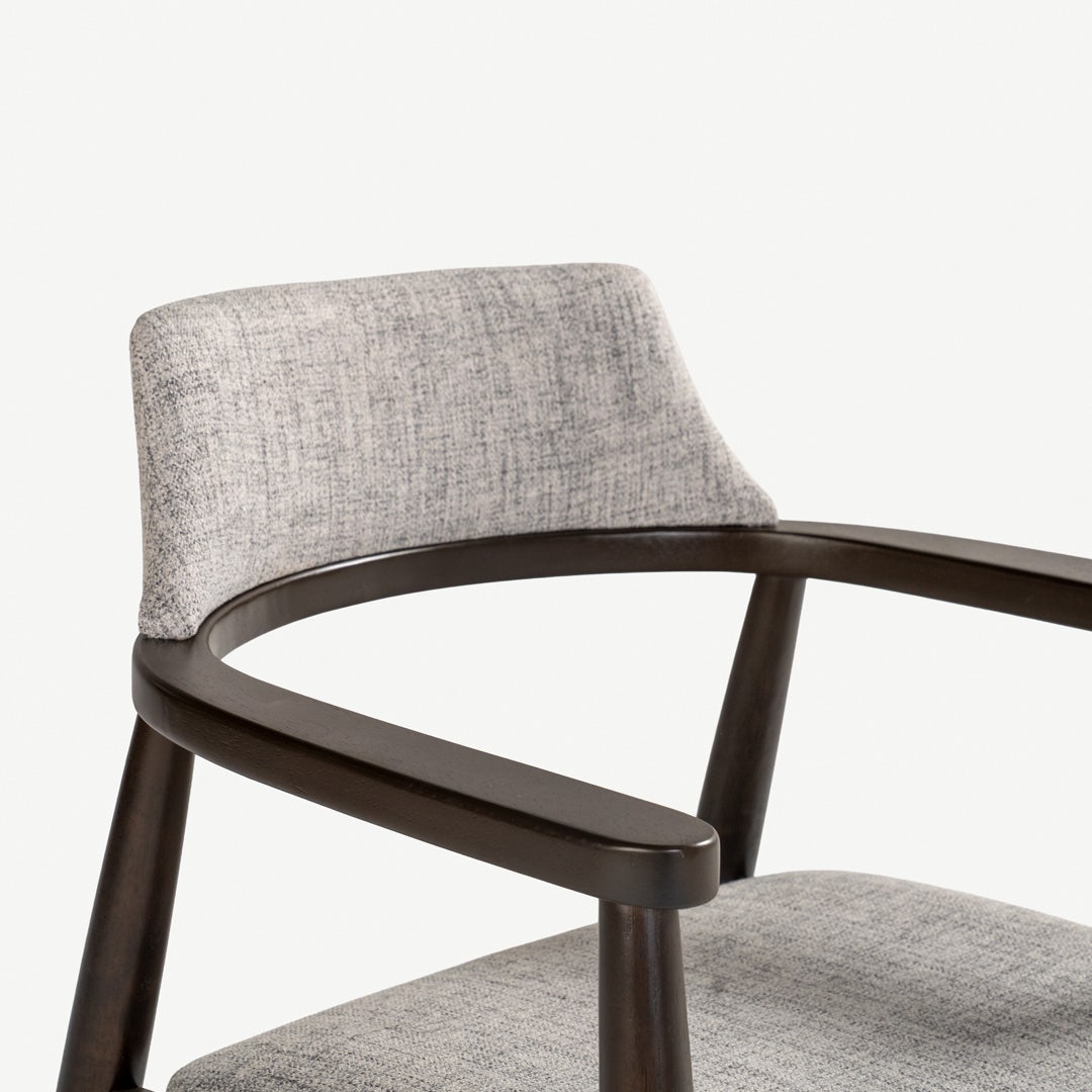 A seat you’ll keep coming back to. Karmil’s solid wood frame feels sturdy yet light, with gently curved armrests that give you room to relax. The padded seat and backrest in a neutral fabric add just enough comfort for long dinners or a quiet coffee break.