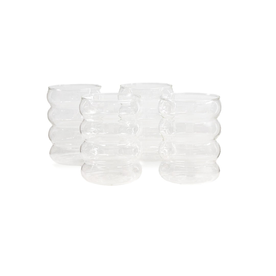 The Lollie Glass Set is a perfect drinkware collection, designed with a rounded, wavy form. These glasses feel soft in the hand and elevate even simple drinks with their sculptural clarity. * High borosilicate glass construction for durability and heat resistance. * Set includes 4 glasses, 300 ml each. * Wavy, rounded shape for a unique modern aesthetic. * Dishwasher-safe material (handwash recommended for longevity)