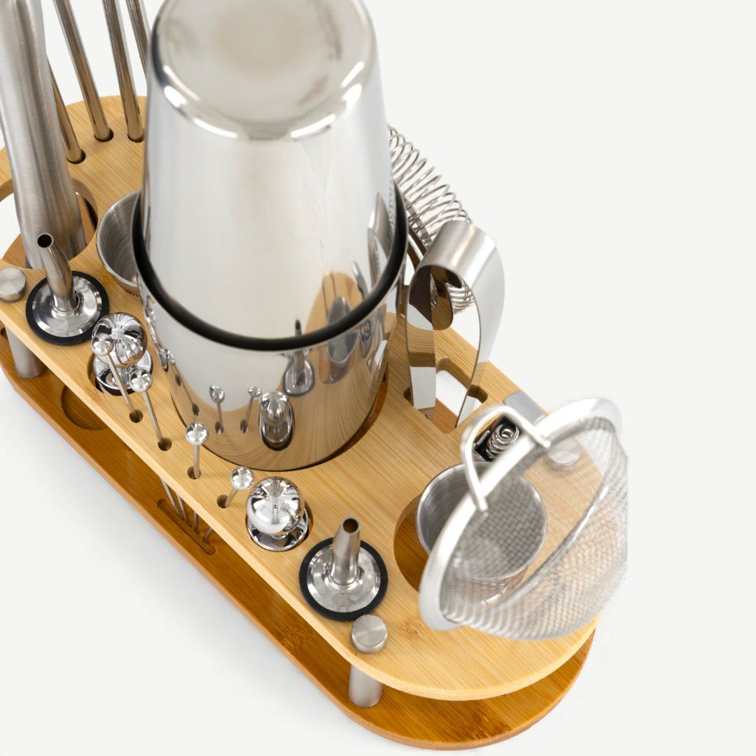 The Mervo bar accessories set brings a warm, crafted feel to cocktail-making, combining polished stainless steel tools with a natural bamboo stand. Everything is thoughtfully arranged, turning your bar setup into a display that feels organised rather than cluttered.