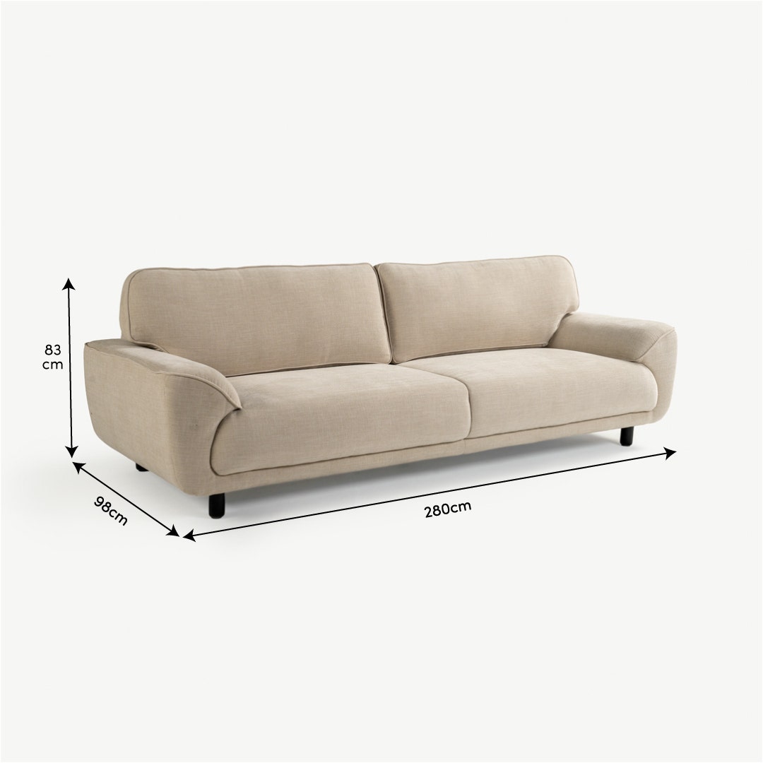 The Moryan 4-Seater Sofa blends soft curves with clean, modern lines to create an inviting centerpiece for your living room. Its smooth ecru fabric and plush cushioning offer a calm, relaxed feel. This generous 4-seater makes it perfect for family lounging and everyday comfort. * Upholstered in soft, durable fabric. * Built with a strong wood frame for long-lasting support. * Sculpted armrests and rounded edges for a modern silhouette. * Spacious 4-seater size ideal for larger living spaces.