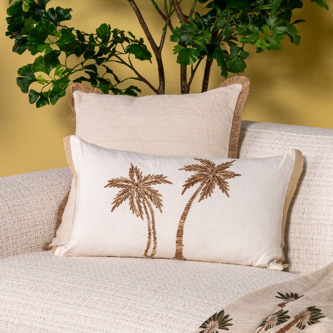 This long and lean Nahla cushion fits beautifully across benches, beds, or narrow couches. A tasteful cushion in ivory shades with detailed embroidery.