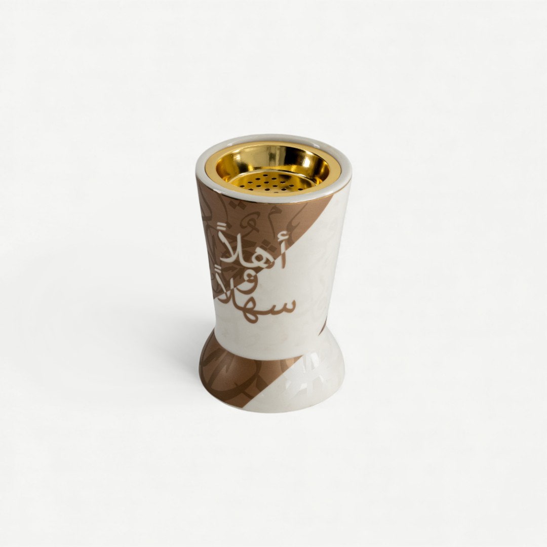 The Naim Oud Burner transforms everyday fragrance rituals into a considered design moment. Crafted in ceramic with a sculptural shape, flowing Arabic calligraphy wraps around the form in soft neutral tones, while a gold-toned metal insert adds contrast and refinement. The mix of matte ceramic and metallic detail gives the piece presence, whether in use or styled as décor.